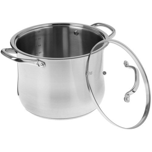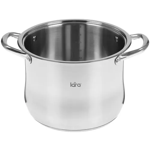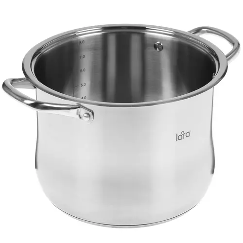 Кастрюля оснащена двумя металлическими ручками на заклепках и внутренними отметками литража.