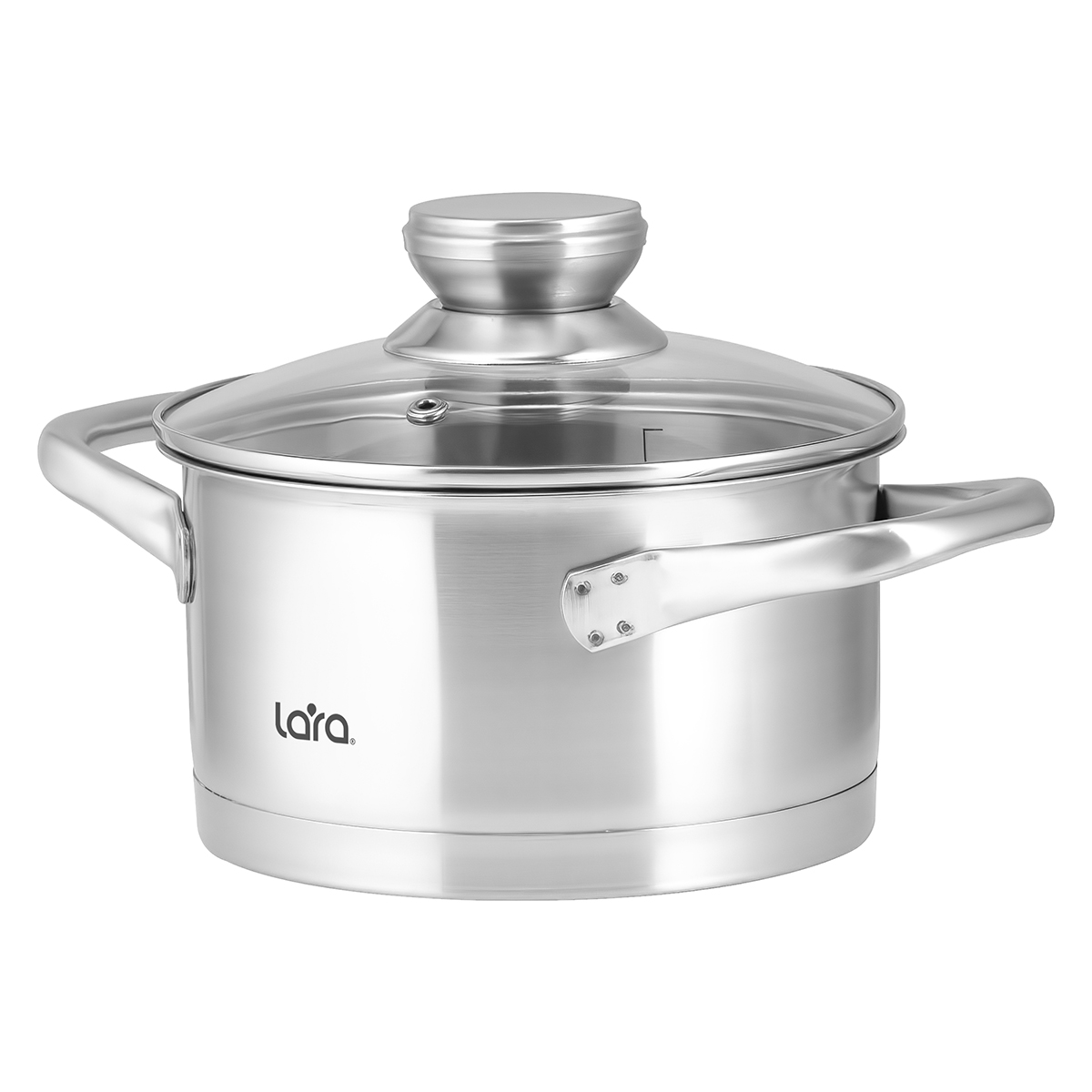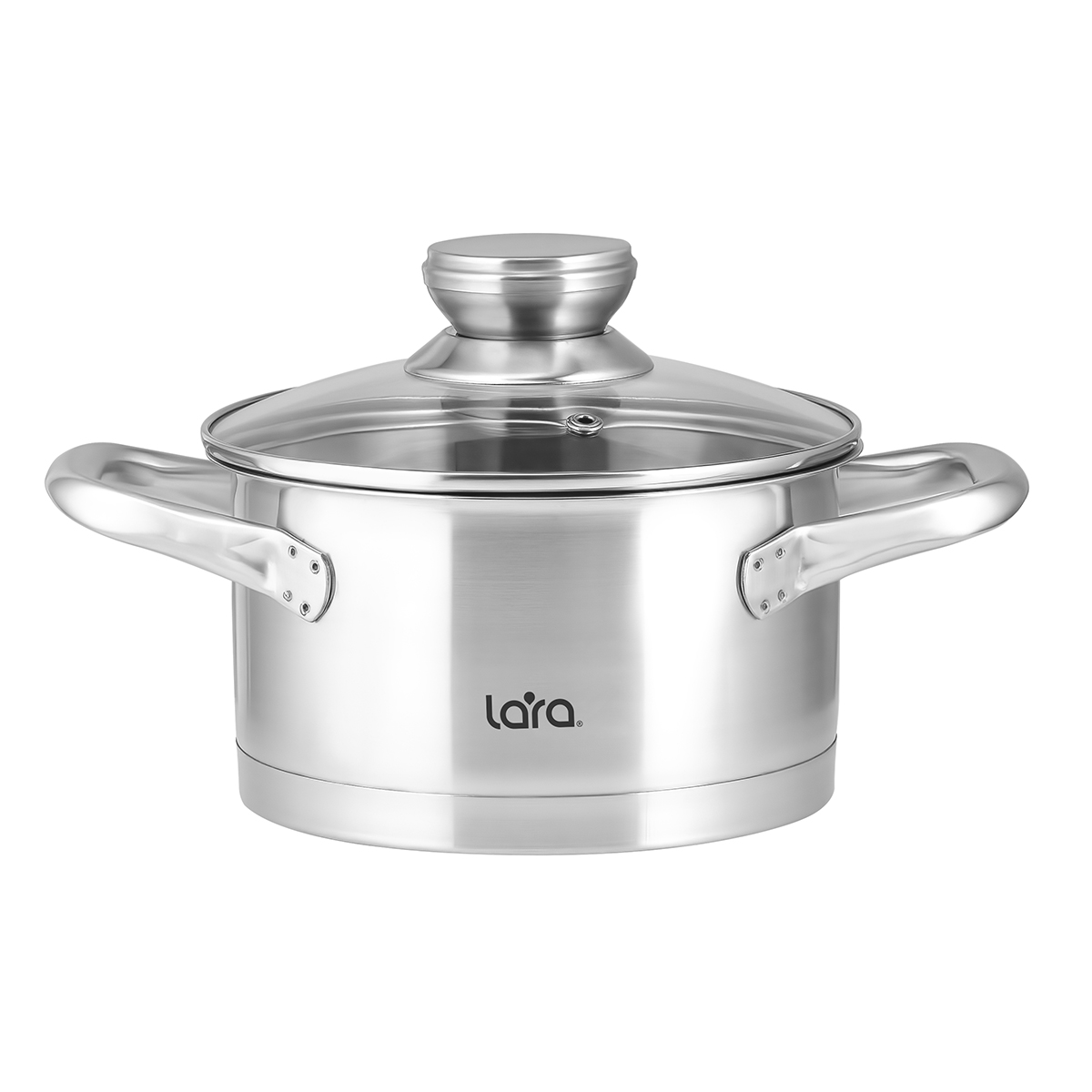 Кастрюля с полной матовой полировкой и ультрасовременным прямым корпусом LARA “DYNASTY” отличается развальцованным краем для слива без потеков. Каждая ручка приварена к корпусу сразу в 8 точках, что увеличивает безопасность. Малая площадь контакта ручек с кастрюлей снижает риск ожога. На этой кастрюле крышка лежит максимально плотно. Утолщенное дно и стенки способствуют равномерному разогреву содержимого: это положительно сказывается на сохранении витаминов, питательных веществ и вкусовых качествах блюда. Подходит для любых типов плит. Полностью индукционное дно декорировано гравировкой фирменного логотипа, материала и объема кастрюли.