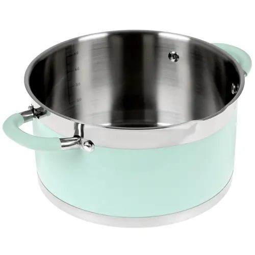 Конструкция дополнена двумя металлическими рукоятками с силиконовыми накладками, капсулированным индукционным дном и небольшим носиком для аккуратного слива воды.