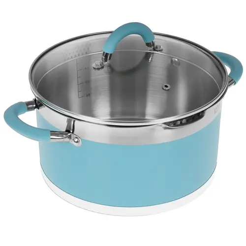 Посуда дополнена специальным носиком для слива жидкости, что особенно удобно при варке овощей на салат. Ручки с накладками из бакелита не скользят и не обжигают ладони. Кастрюля поставляется со стеклянной крышкой, дополненной ручкой и отверстием для выхода пара.