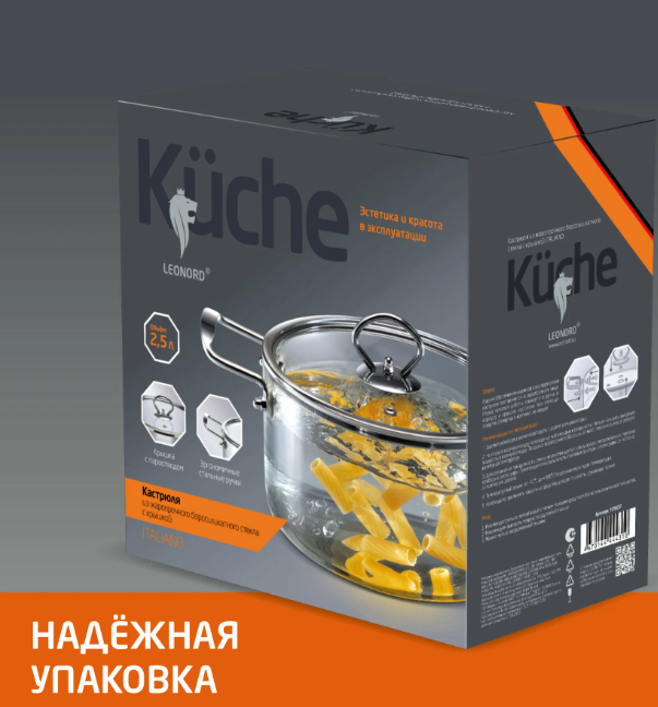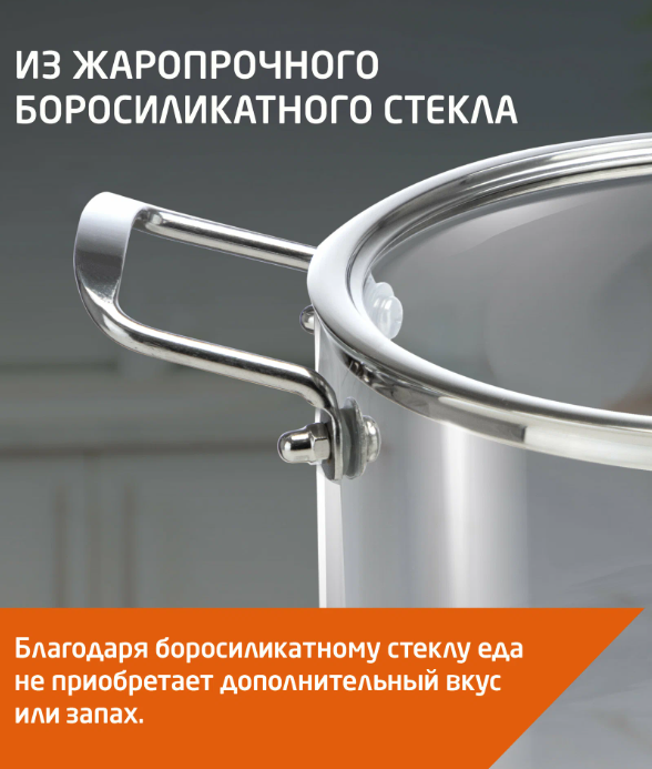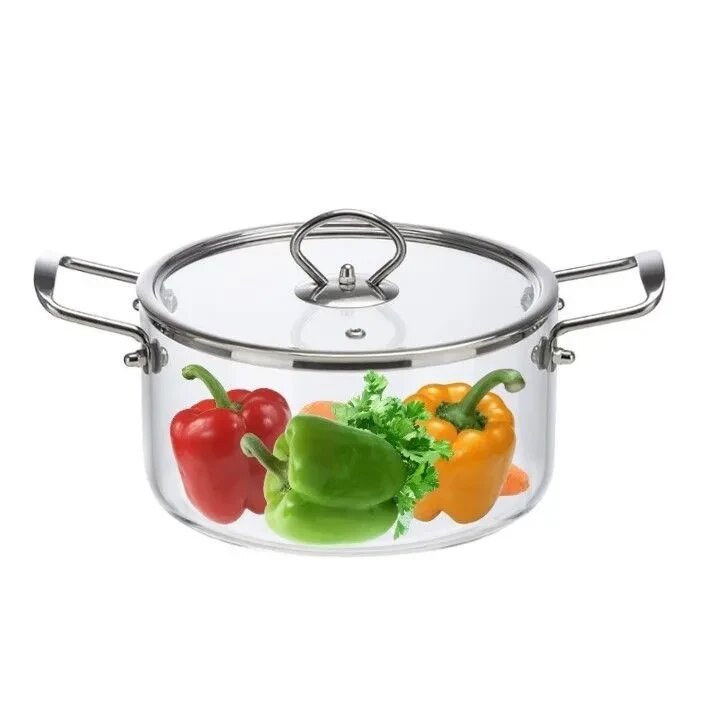 Кастрюля, объем 2.5 л, из жаропрочного боросиликатного стекла с крышкой с пароотводом предназначена для приготовления еды.