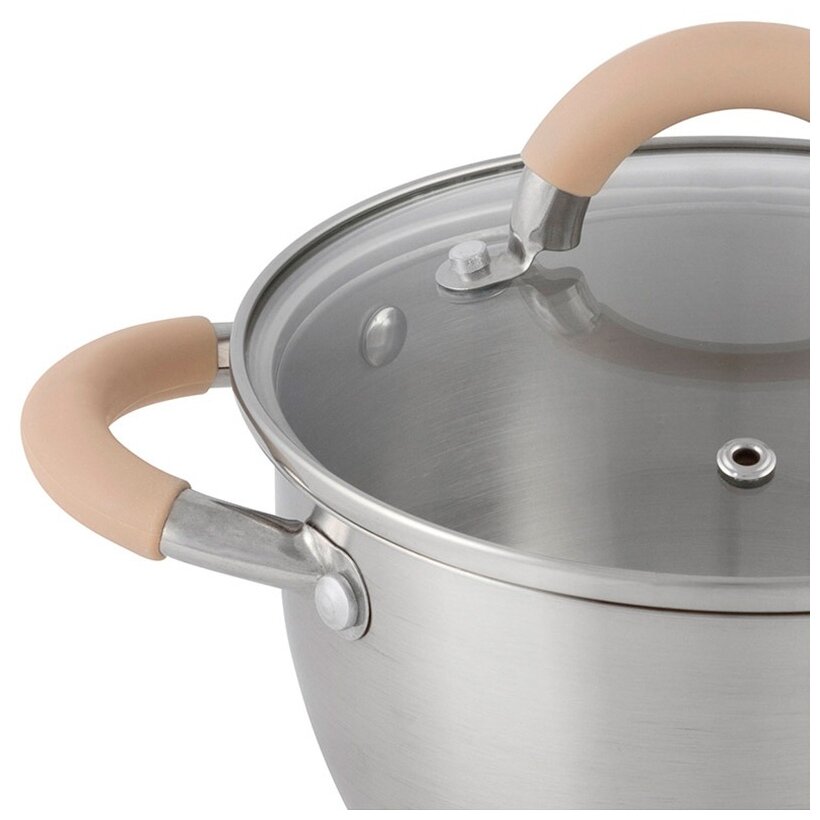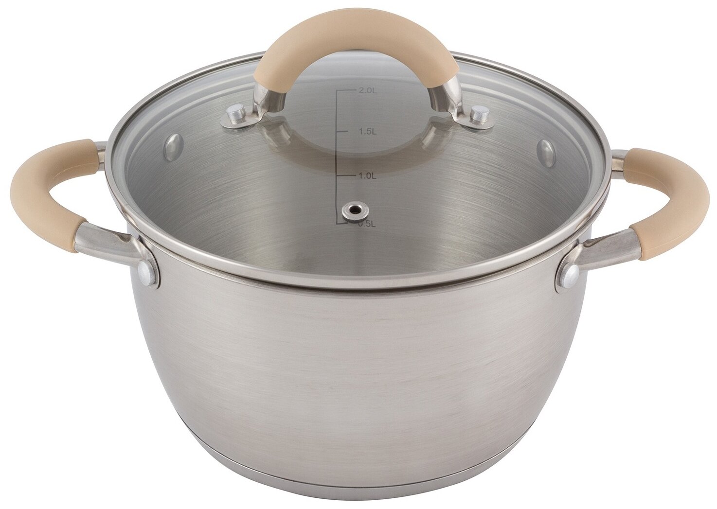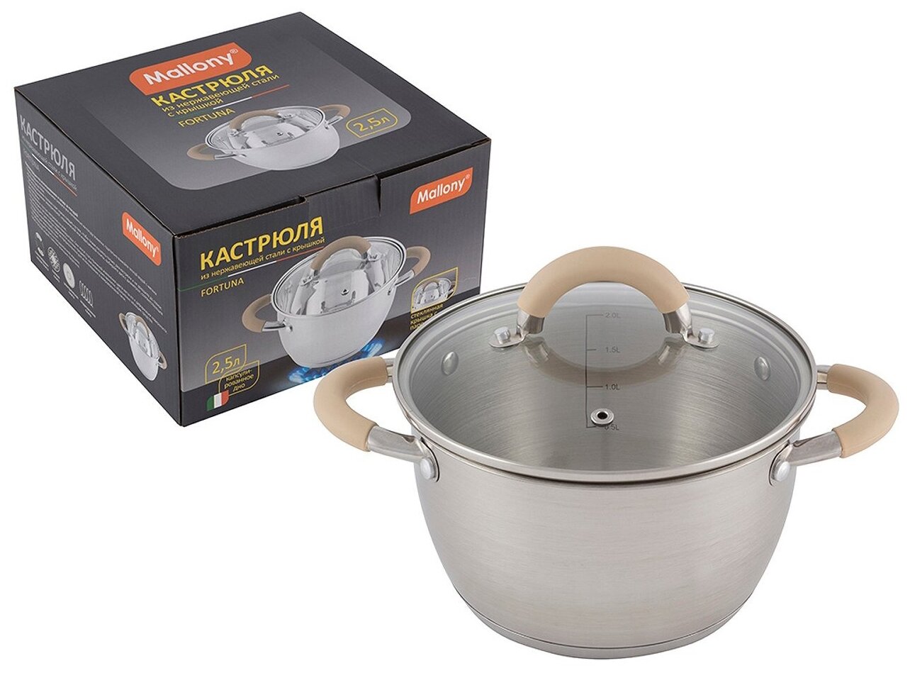 Кастрюля из нержавеющей стали с крышкой Fortuna 2,5 л V-shape, подходит для всех типов плит, матовая внутри и снаружи, имеет отметки литража. Крышка из жаропрочного стекла с отверстием для выпуска пара С-тип, ручки полые из нержавеющей стали 201 с силиконовыми вставками.