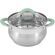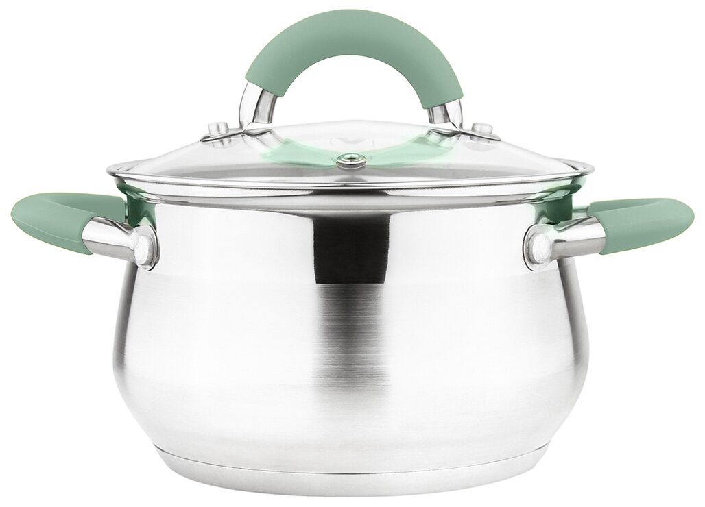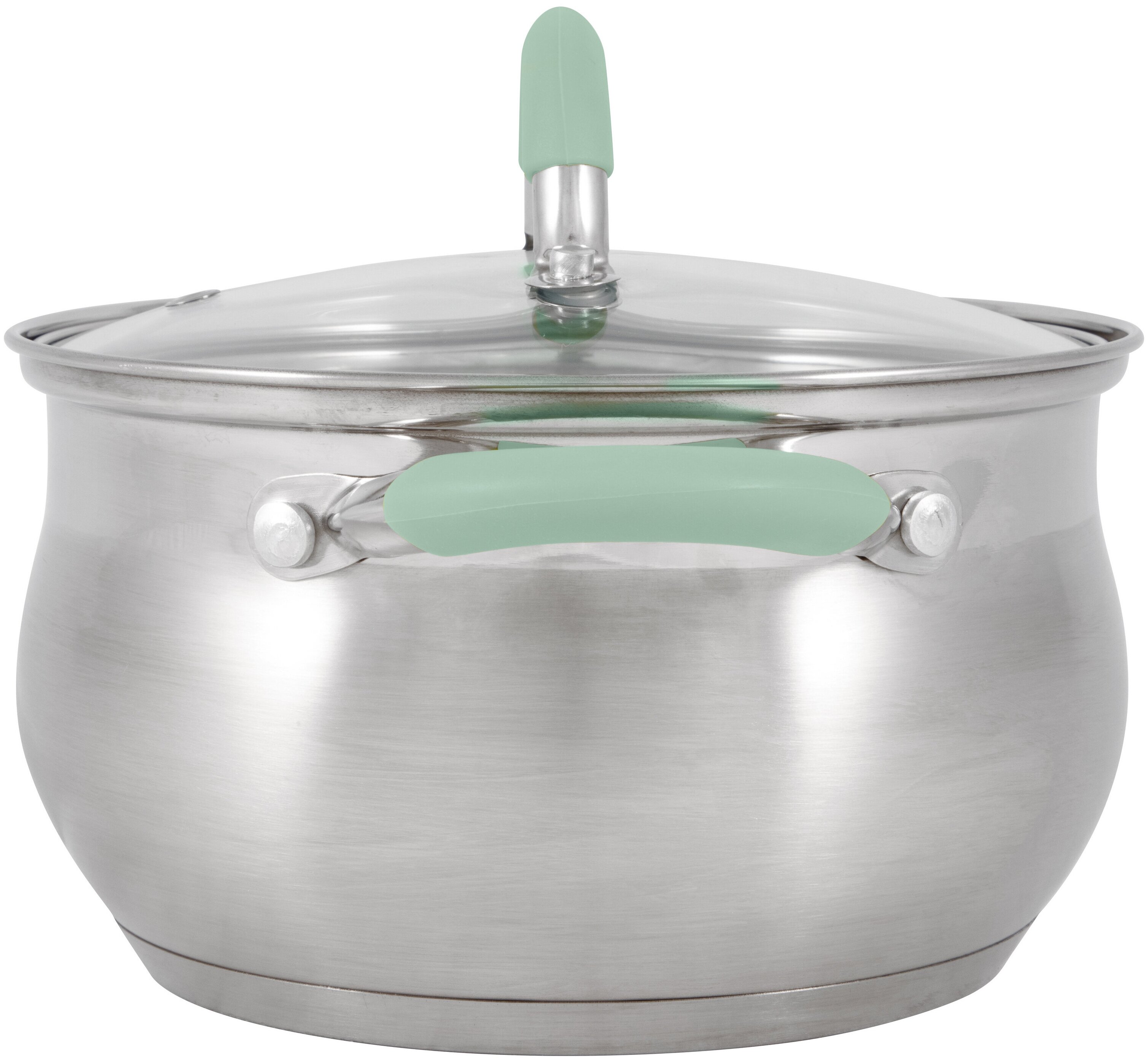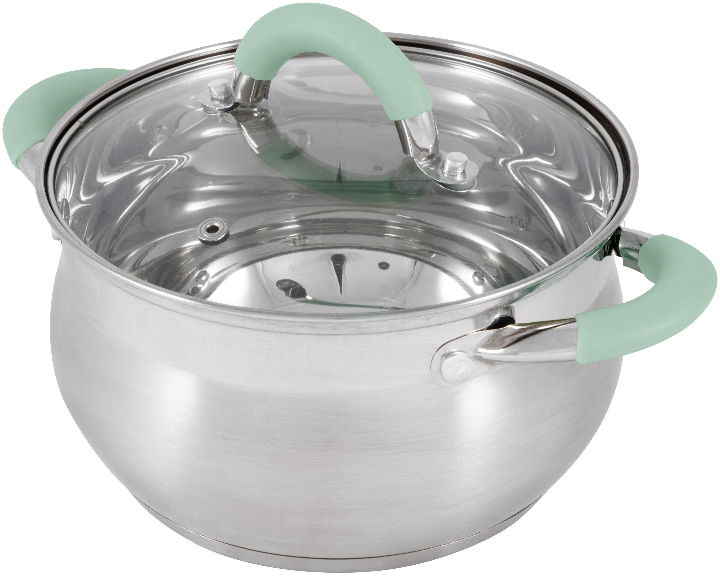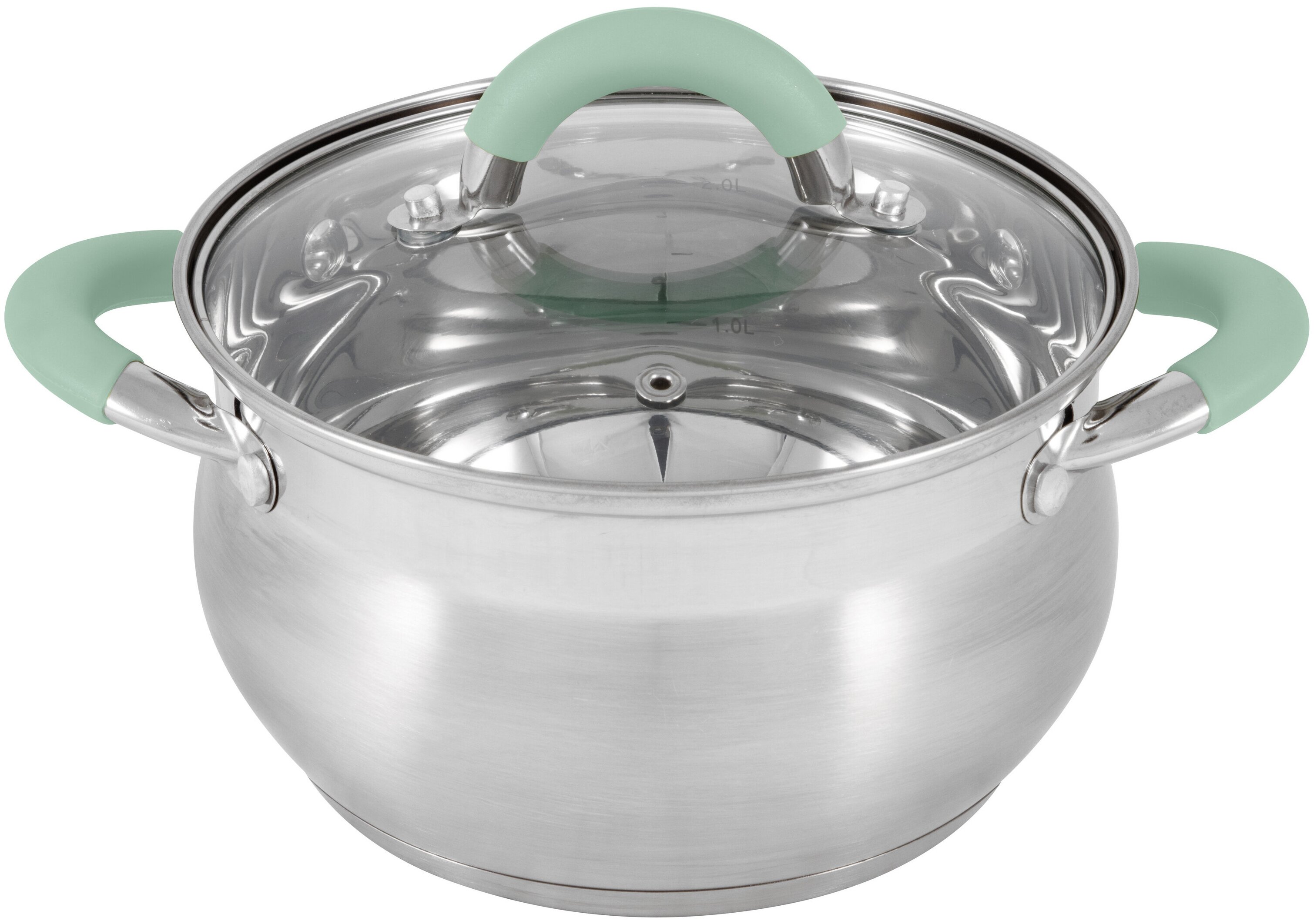 силиконовое покрытие на ручках; для всех типов плит; крышка из жаропрочного стекла с отверстием для выпуска пара; смешанная полировка внешнего корпуса, внутри - зеркальная полировка
