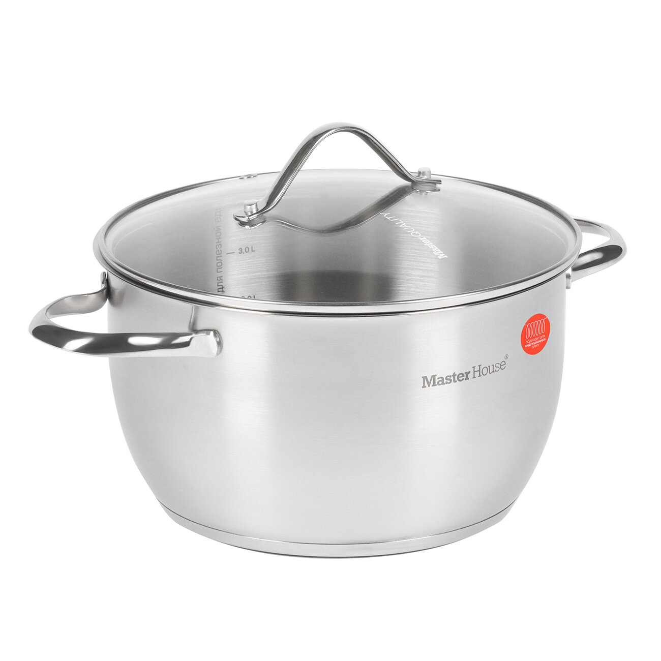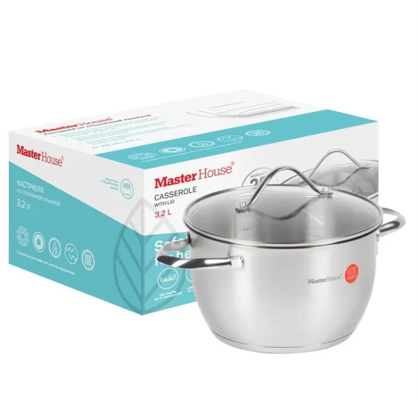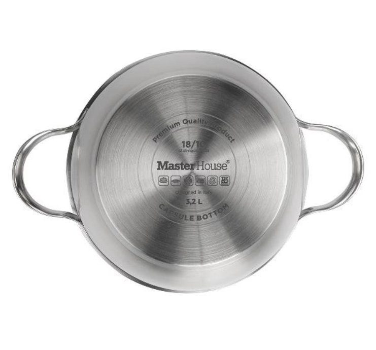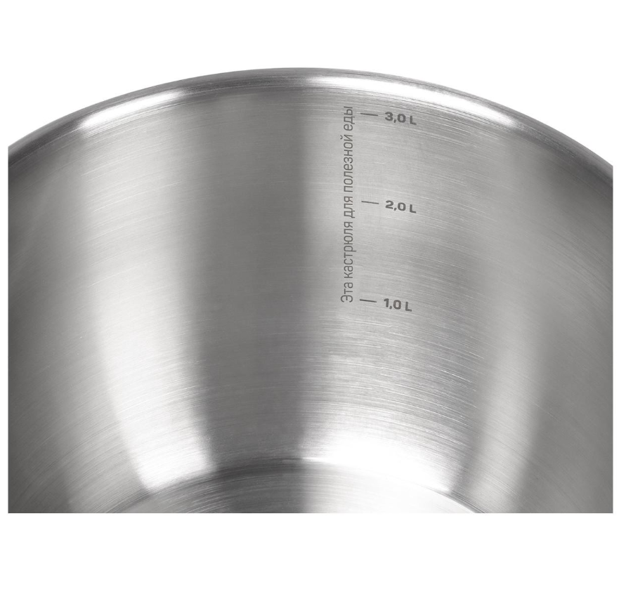 Кастрюля объемом 3,2 л выполнена из нержавеющей стали марки 18/10 — в сплав добавлены хром и никель. Это сочетание придает металлу повышенную прочность и устойчивость к коррозии.