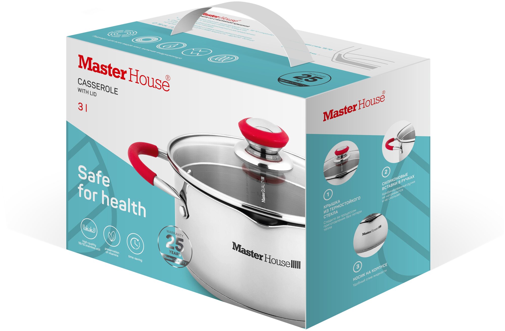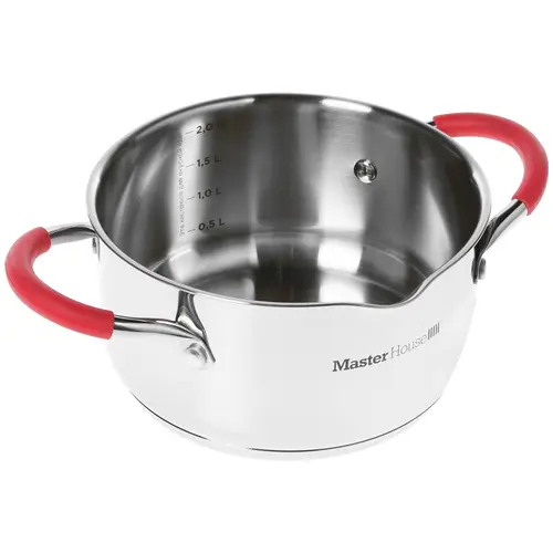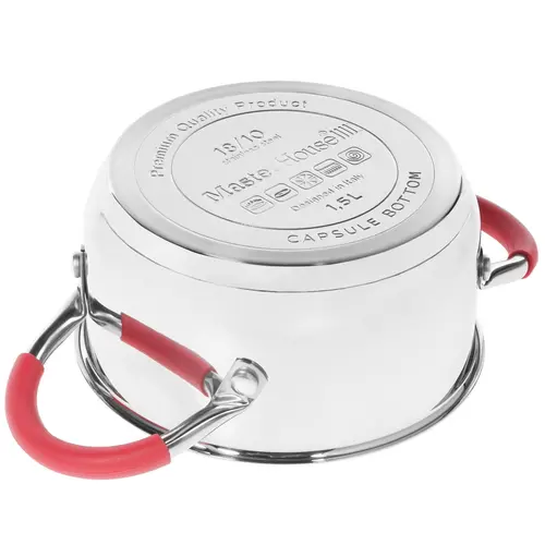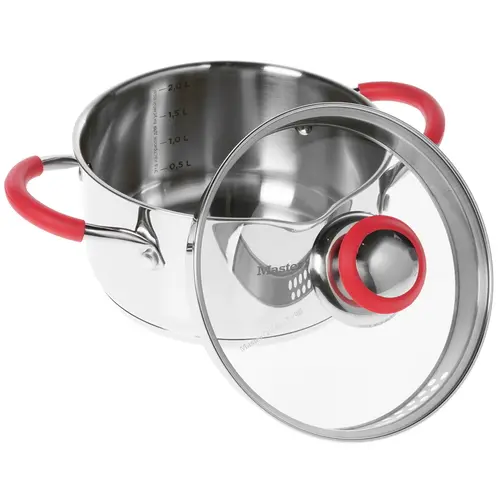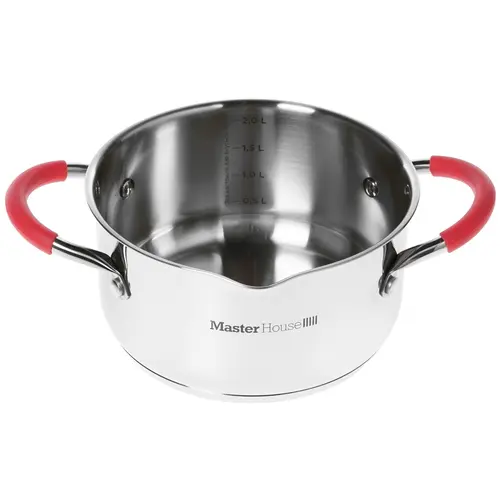 Кастрюля из нержавеющей стали имеет естественную серебристую расцветку с контрастными красными вставками. Посуда дополнена зеркальной полировкой внутренних стенок, а также двумя удобными ручками с силиконовыми накладками. Также имеется небольшое отверстие для аккуратного слива воды.