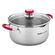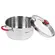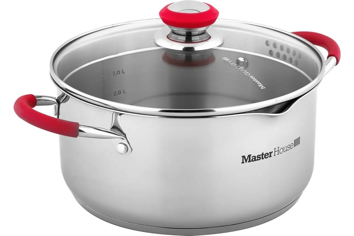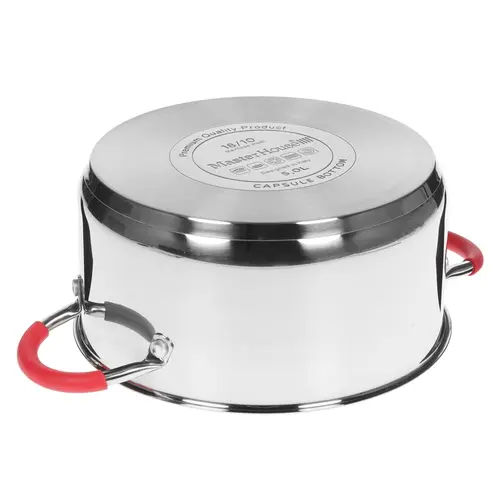 Кастрюля вмещает 5 литров, что удобно для готовки супа и подобных блюд большими порциями. Посуда из нержавеющей стали имеет естественную серебристую расцветку с контрастными вставками на ручках. Изделие поставляется с термостойкой стеклянной крышкой, дополненной нескользящей рукояткой и отверстием для пара.