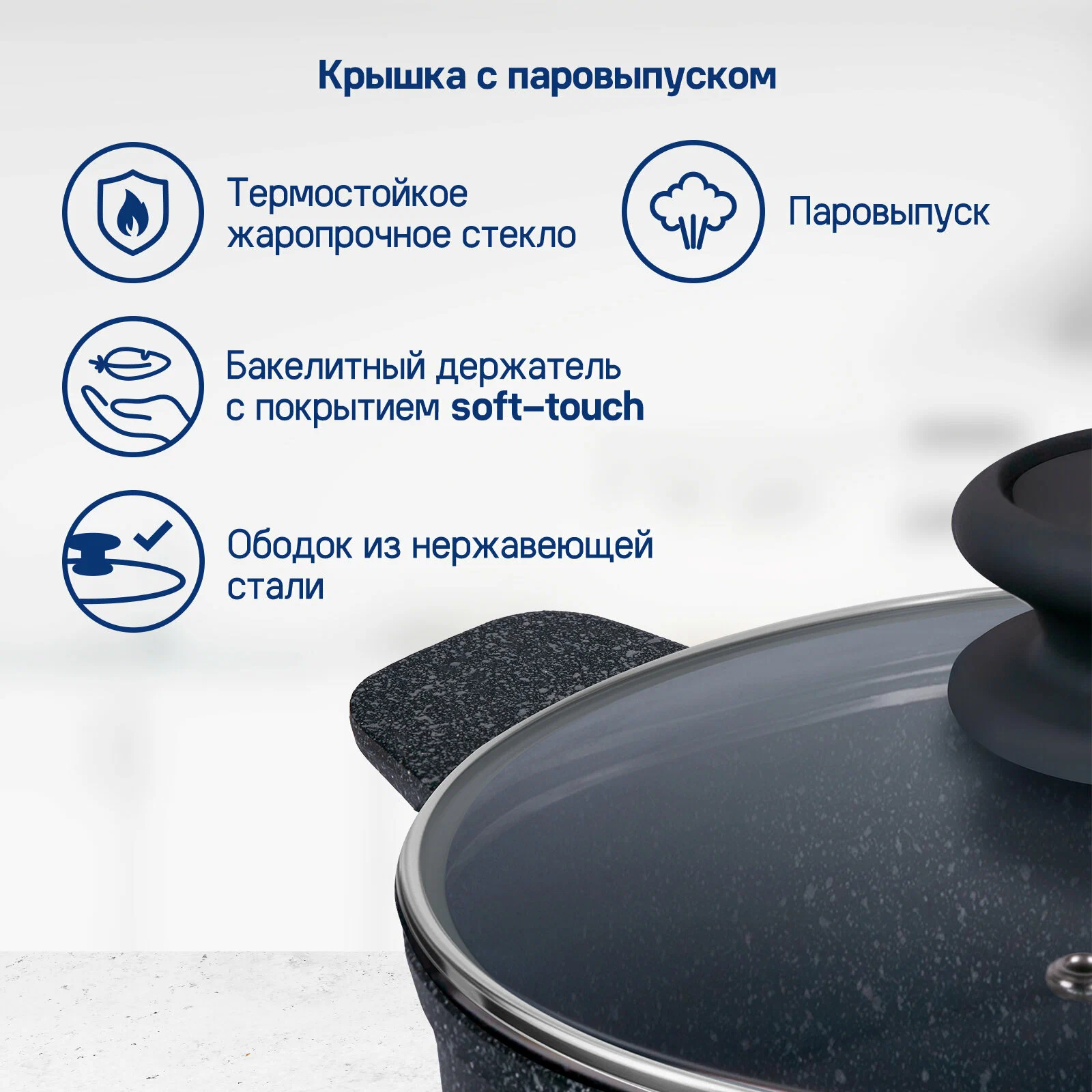 Крышка с паровыпуском из жаропрочного стекла, и ободком из нержавеющей стали. Держатель из термостойкого бакелита с покрытием soft-touch.