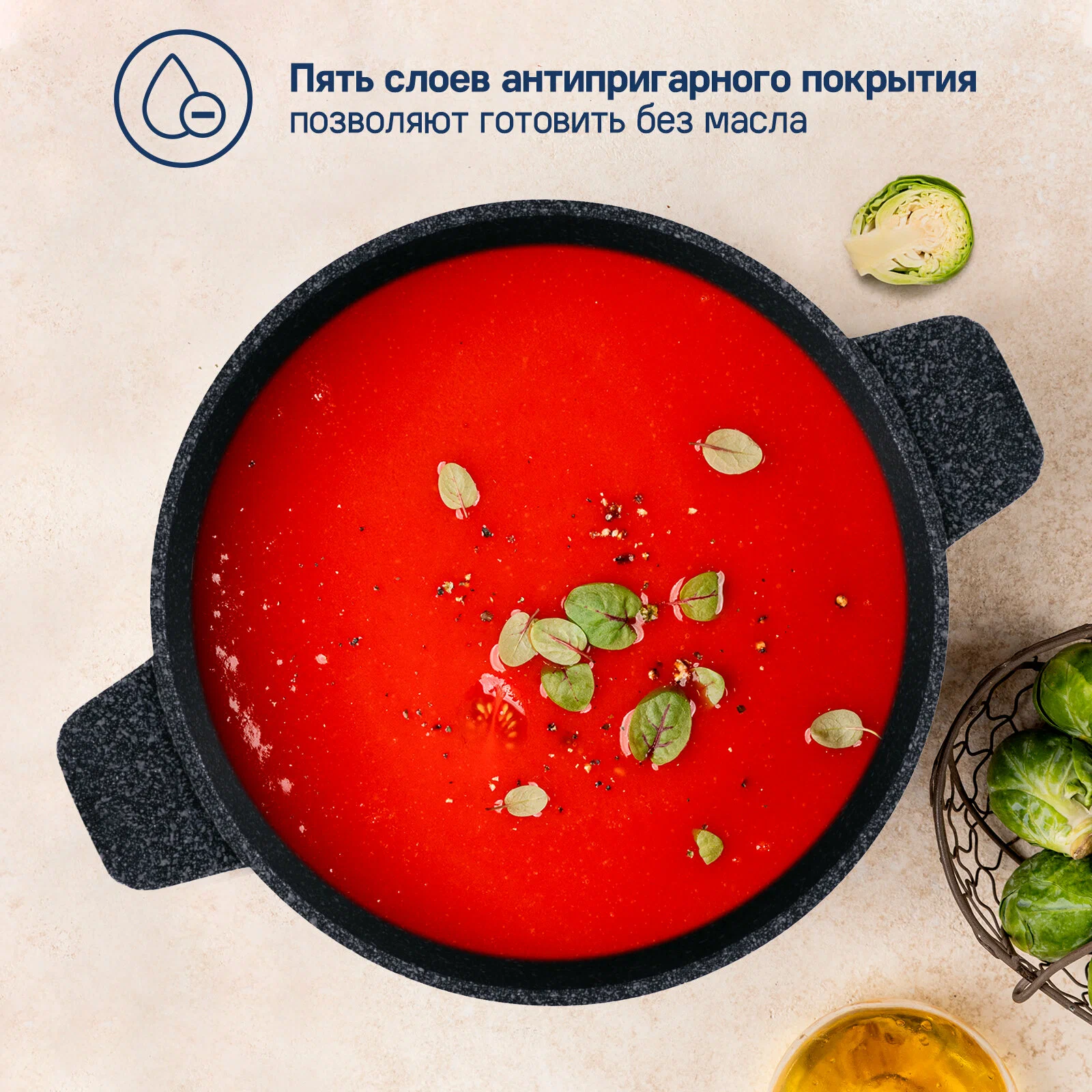 Устойчивое к царапинам, полностью безопасное антипригарное покрытие с эффектом "мрамор", позволяет готовить блюда без использования большого количества масла. Не содержит свинец и кадмий, без PFOA.