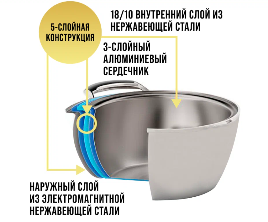 Кастрюля с крышкой выполнена из высококачественной нержавеющей стали с многослойным термоаккумулирующим дном, способствующим высокой теплопроводности и равномерному распределению тепла.