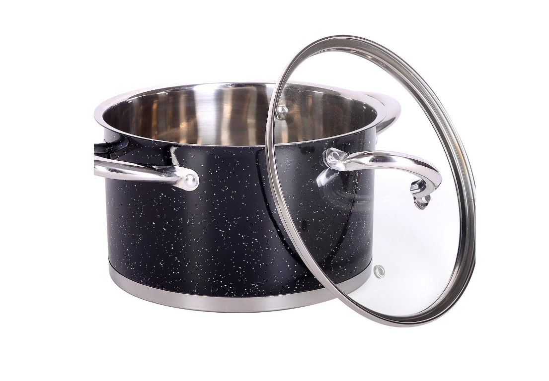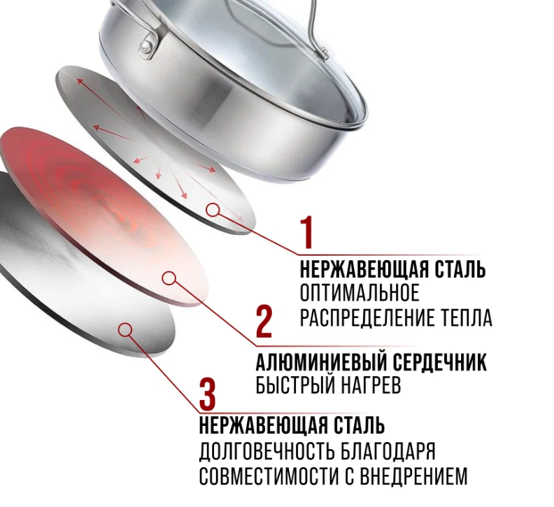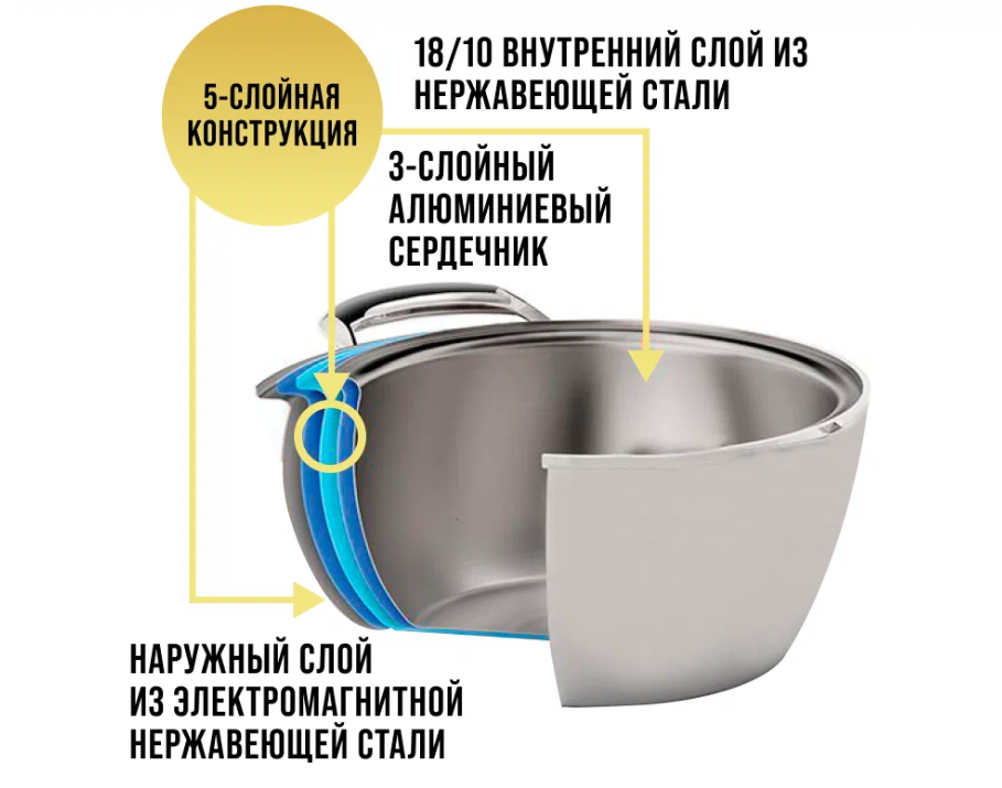 Кастрюля с крышкой выполнена из высококачественной нержавеющей стали с многослойным термоаккумулирующим дном, способствующим высокой теплопроводности и равномерному распределению тепла.