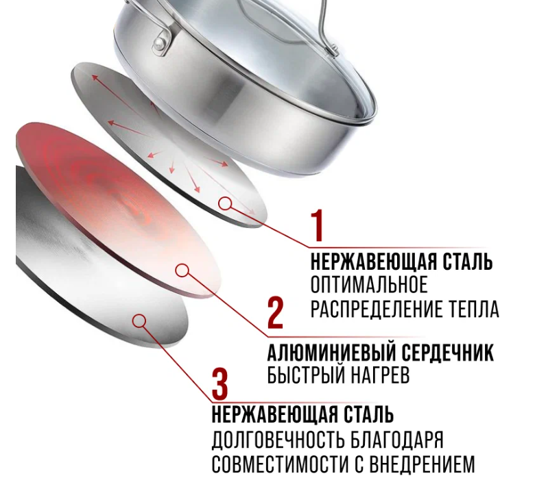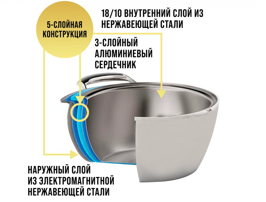 Кастрюля с крышкой выполнен из высококачественной нержавеющей стали с многослойным термоаккумулирующим дном, способствующим высокой теплопроводности и равномерному распределению тепла.