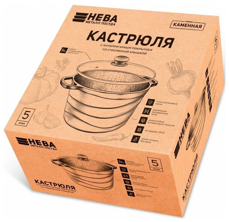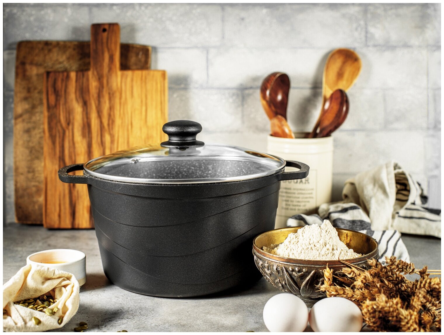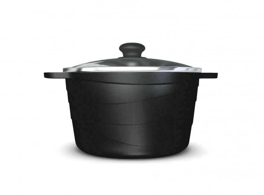 Кастрюля имеет современный прямой корпус из литого алюминия с уникальным геометрическим рисунком волна.