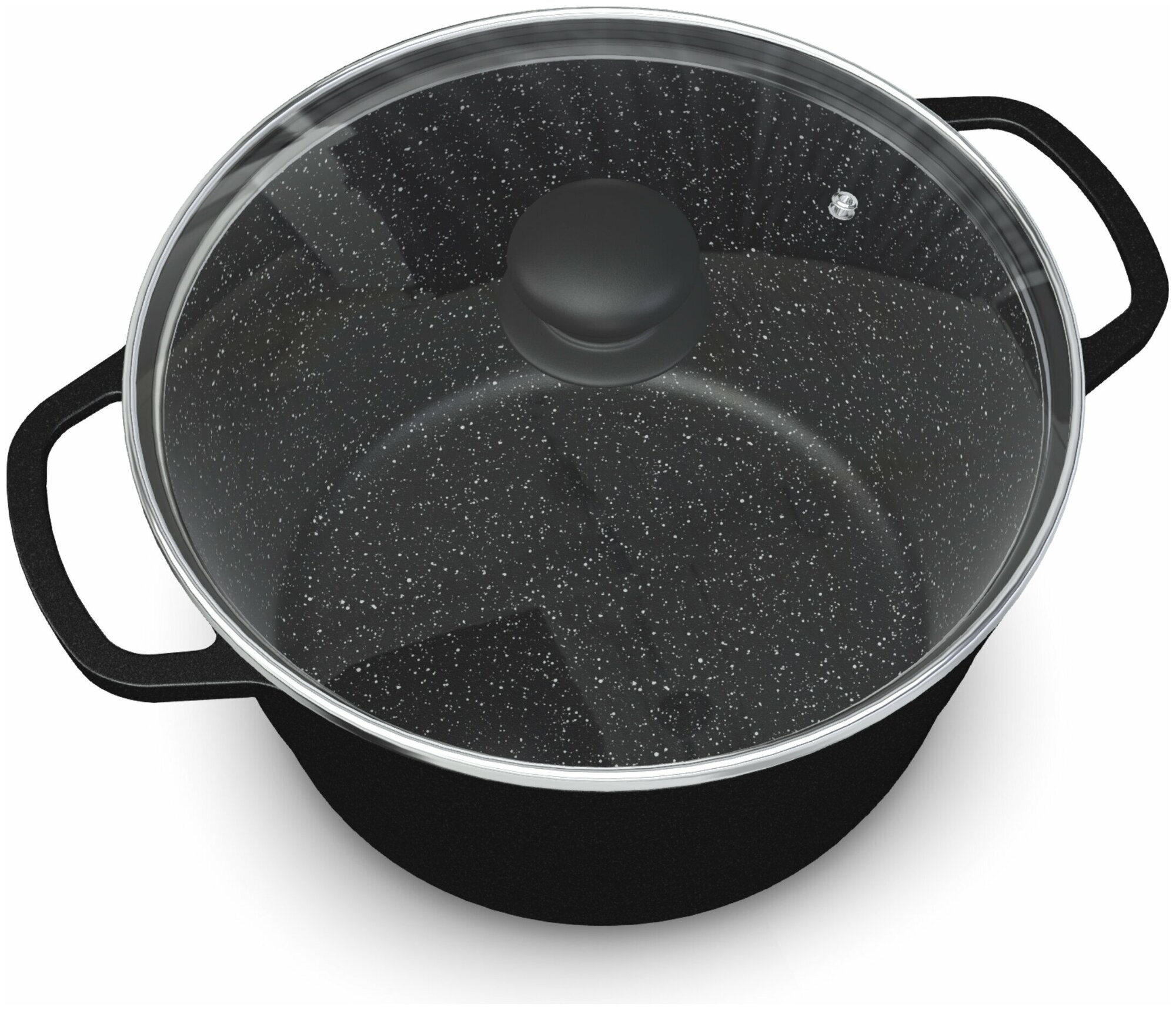 Кастрюля комплектуется крышкой из жаростойкого стекла с ободом из высококачественной нержавеющей стали.