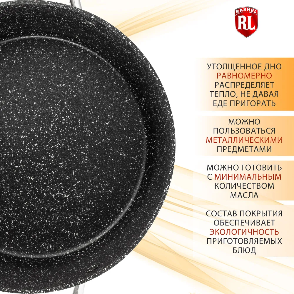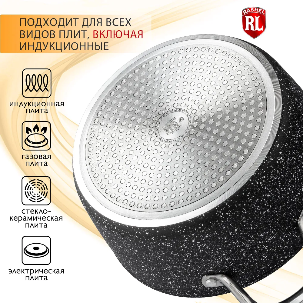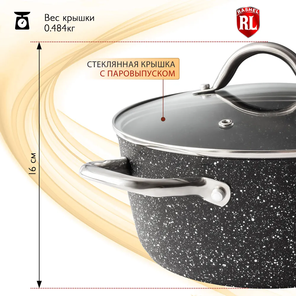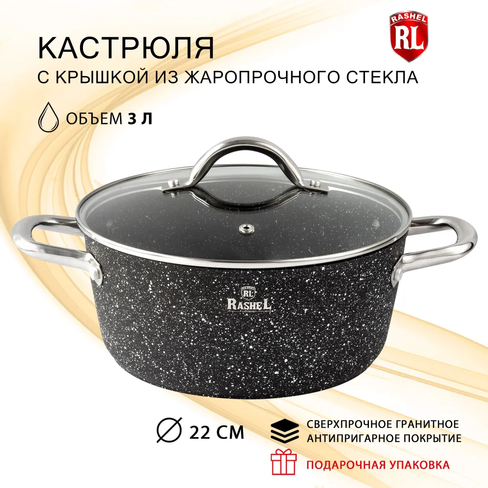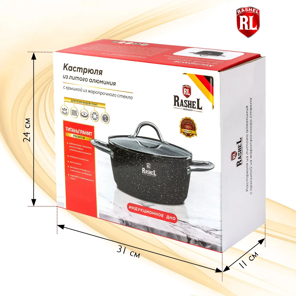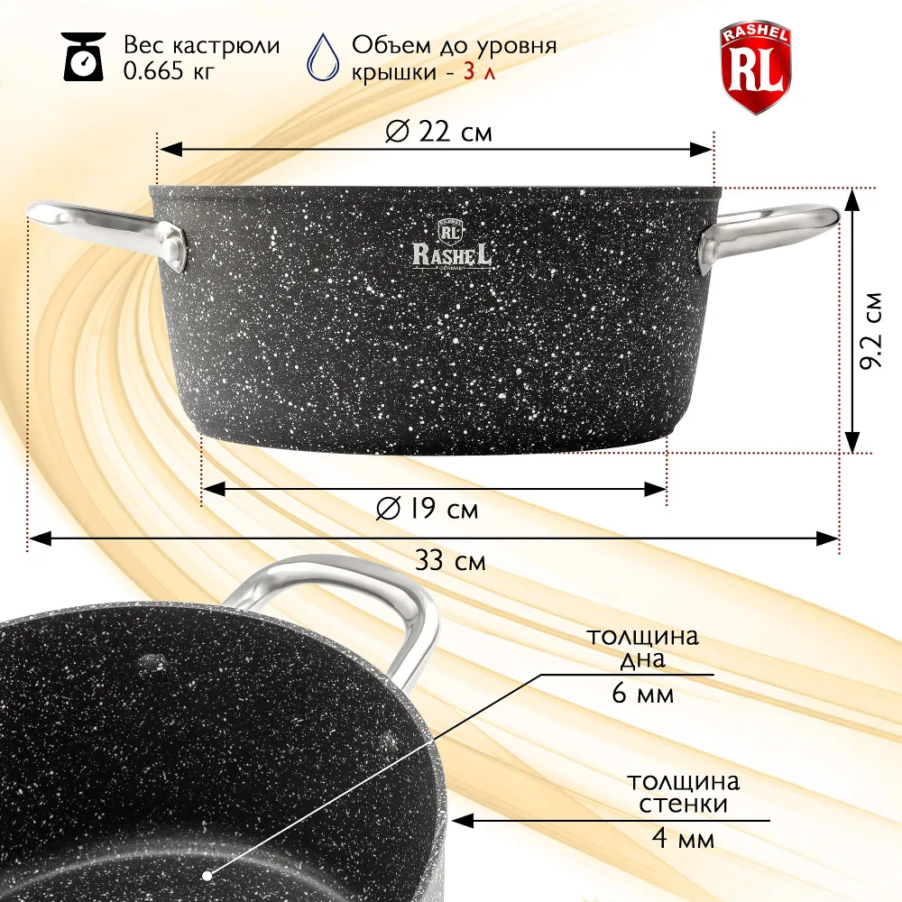Кастрюля универсальная 3 литра с крышкой 22 см из серии ТИТАН&ГРАНИТ бренда Рашел изготовлена из литого алюминия со сверхпрочным гранитным антипригарным покрытием. Разработана с оглядкой на современные тренды, поэтому вы всегда отличите нашу кастрюльку из ряда других брендов. Внутреннее и внешнее сверхпрочное гранитное антипригарное покрытие отличается повышенными показателями по износостойкости и увеличенной устойчивостью в случае воздействия острых предметов, в отличии от кастрюли из нержавеющей стали, да и в принципе посуды. Преимуществом данного покрытия является прочность, а также свойства быстро нагреваться и долго держать тепло. Состав покрытия обеспечивает долговременную защиту поверхности и экологичность приготовляемых блюд. Металлические эргономические ручки из нержавеющей стали 304, расположены по бокам борта изделия. Глубокую кастрюлю можно использовать как жаровню сковородку сотейник с антипригарным покрытием. Сама кастрюля не прозрачная, но крышка да, и можно наблюдать за приготовлением пищи, это очень удобно. Универсальная кастрюля с крышкой из жаропрочного стекла подходит для приготовления с минимальным количеством масла. Цельная крышка плотно прилегает к жаровне, что обеспечивает более быстрое приготовление пищи, и как следовательно экономия времени и средств. Кастрюля отлично подойдет для всех видов каш и круп. Можно использовать как жаровню для оладий блинчиков панкейков яиц сырников творожников так и для мяса птицы плова жаркого получая вкусные блюда, можно сказать, что это просто кастрюля мечта. Кастрюля подходит для всех типов плит, включая индукционные. К кастрюле подойдет любая стандартная, универсальная крышка, соответствующего диаметра. Кухонную посуду можно мыть в посудомоечной машине. Для выбора правильного режима, пожалуйста, следуйте инструкции от вашей посудомоечной машины. Но для продления срока службы антипригарного покрытия рекомендуем мыть изделие вручную.