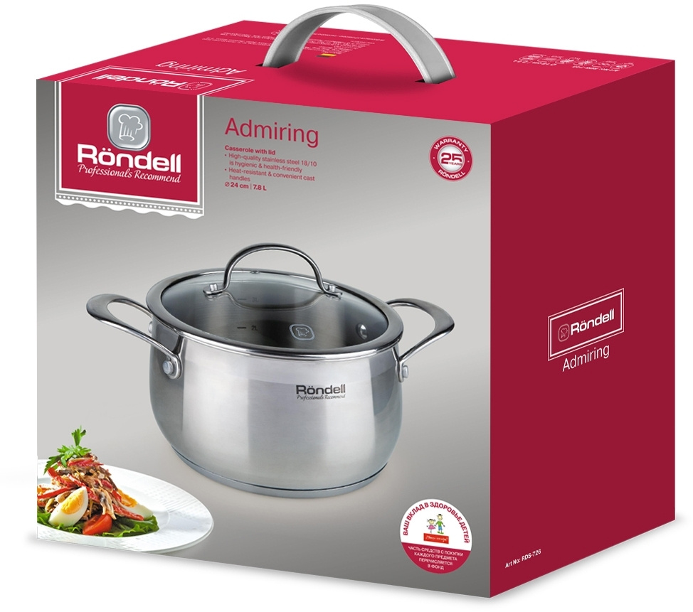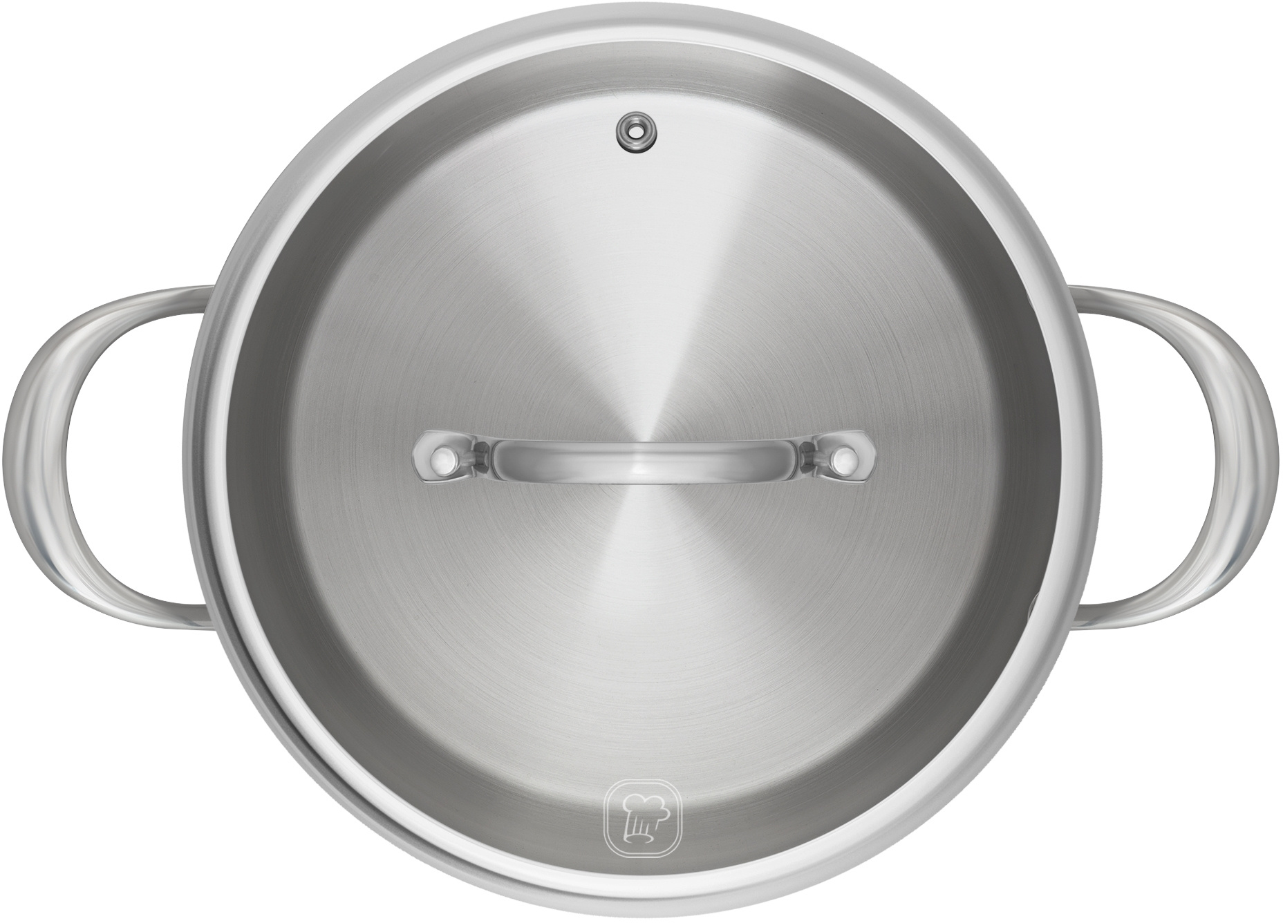Технология: тройное вштампованное, затем вплавленное дно без воздушных полостей. Материал крышки: термостойкое стекло. Аксессуары: Литые, из нержавеющей стали. Преимущества: эргономичная форма ручек; Равномерный прогрев изделия; Округлая форма корпуса; Высокие стенки корпуса – большой литраж посуды