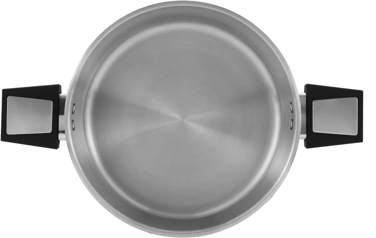 Технология: тройное штампованное, а затем вплавленное дно без воздушных полостей. Аксессуары: стильные бакелитовые ручки со стальными вставками.