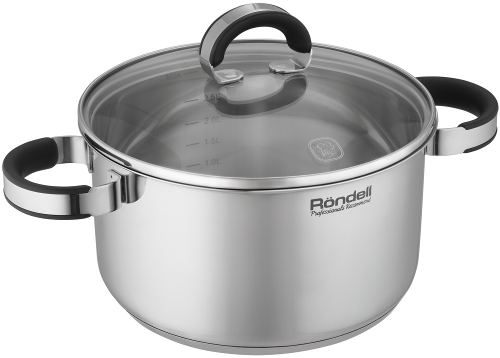 Нерж. сталь 18/10. Тройное дно без воздушных полостей. Крышка из термостойкого стекла с отверстием для выпуска пара и стальным ободком. Стальные ручки с бакелитовыми вставками в эффектном дизайне. Внутренние отметки литража. Для всех видов плит и ПММ.