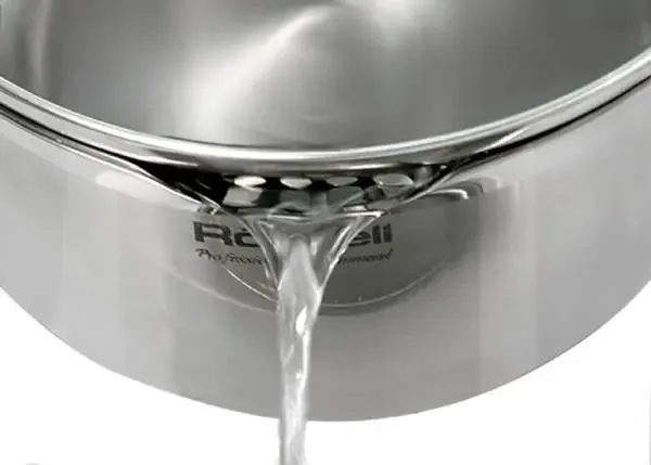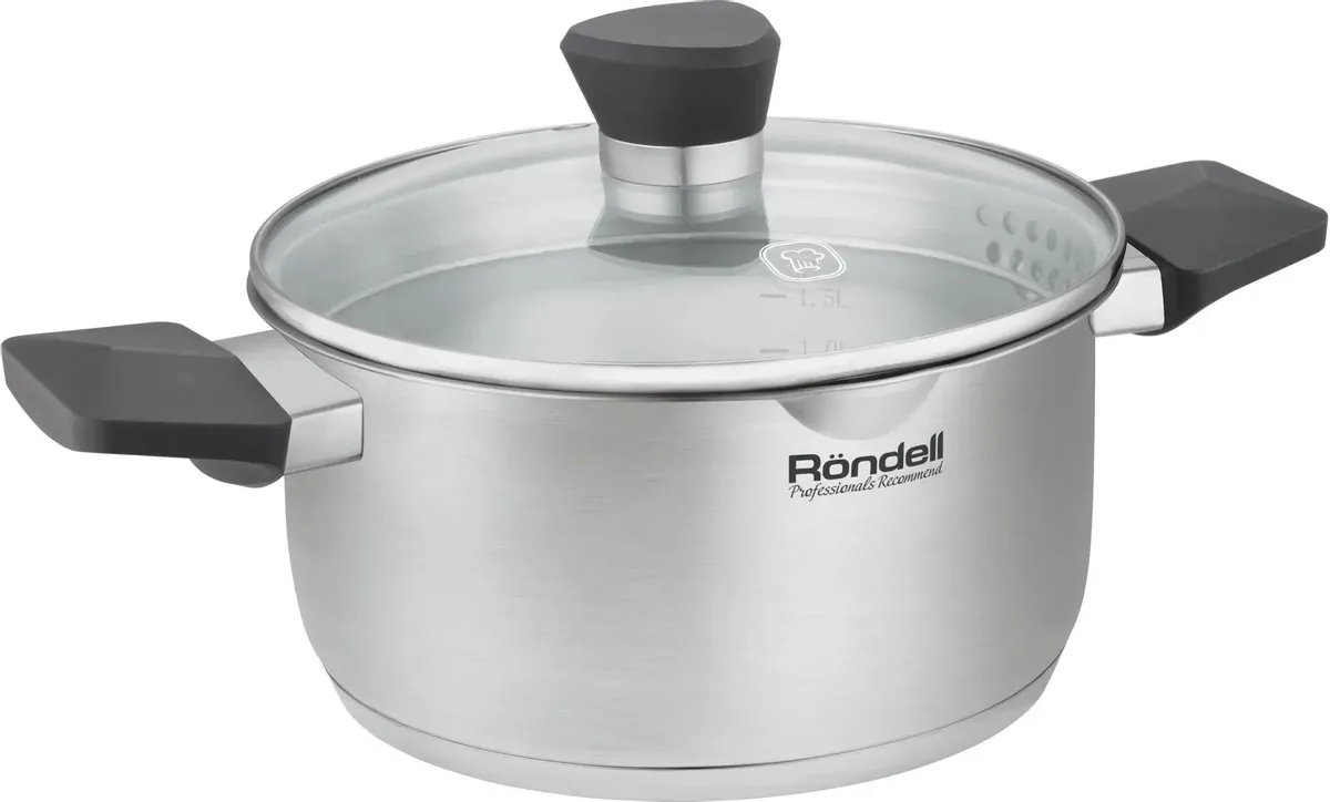 Нерж. сталь 18/10. Тройное дно без воздушных полостей. Оригинальный дизайн крышки для удобного слива жидкости без дуршлага. Ручки из бакелита с покрытием Soft Touch. Внутренние отметки литража. Для всех видов плит, включая индукционные. Гарантия на сталь – 25 лет