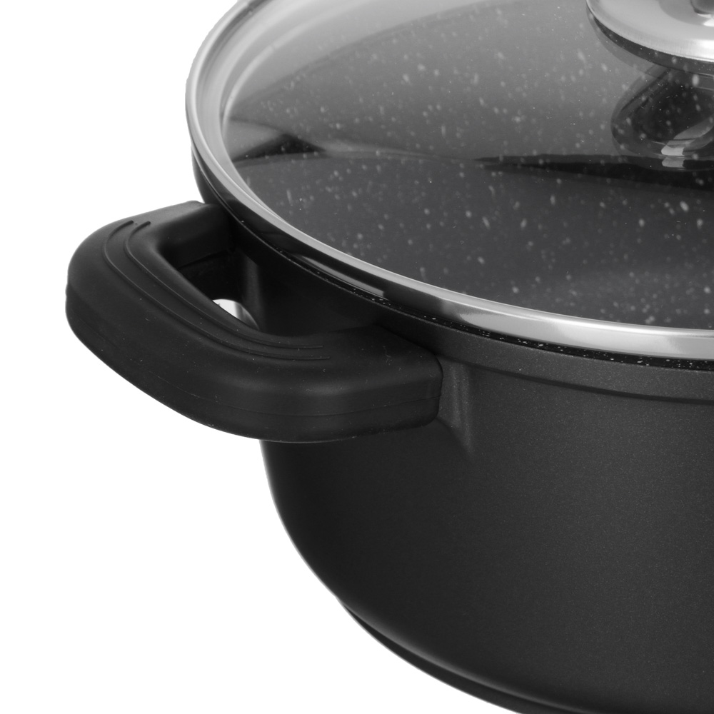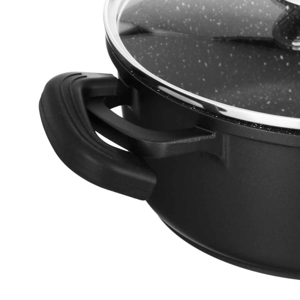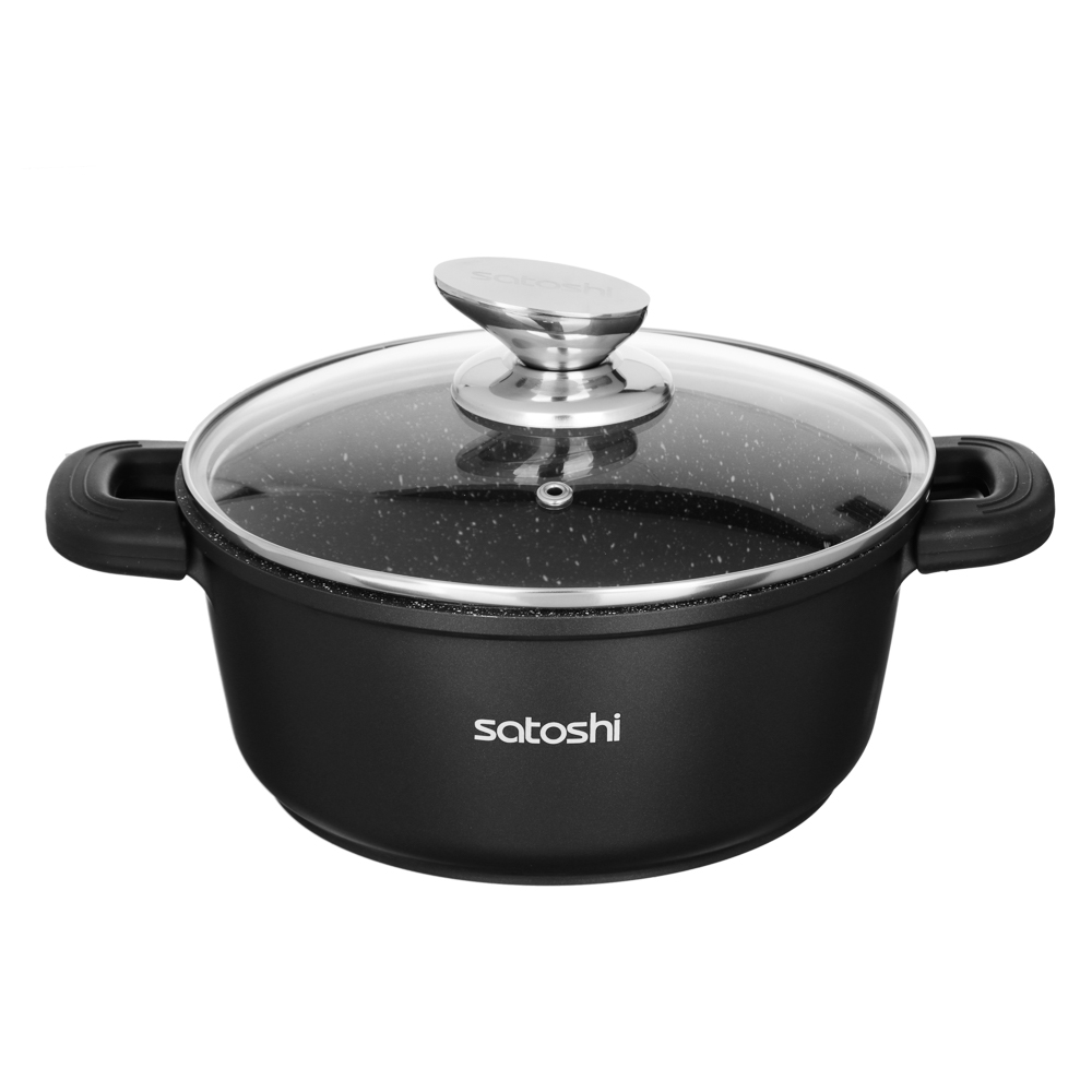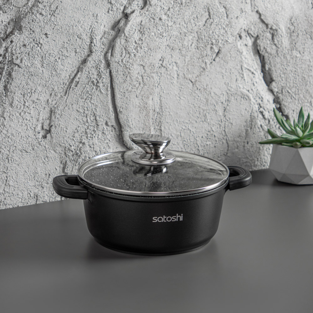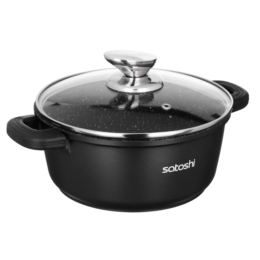 Кастрюля с антипригарным покрытием Satoshi Lion готовит на плите и в духовом шкафу. Силиконовые ручки выдерживают высокие температуры, не плавятся. Крышка из жаропрочного стекла оснащена металлическим ободком. Отверстие для пара исключает проливание кипящей жидкости на варочную поверхность.