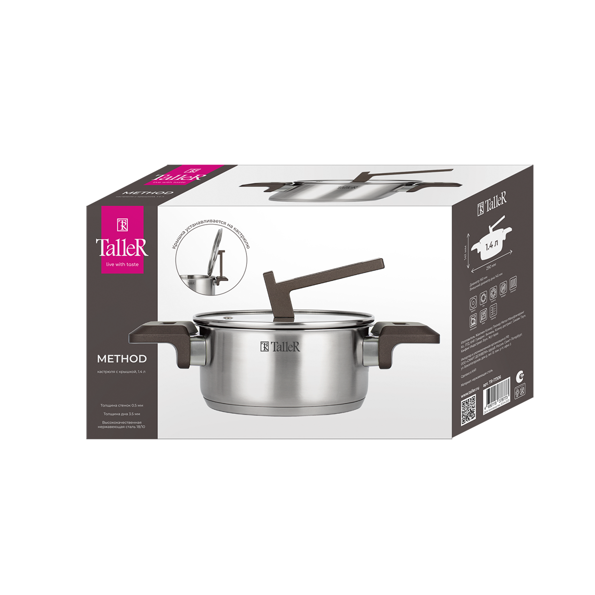 "Кастрюля 1,4л с крышкой, диаметр 16 см, высота без крышки 7,8 см, внешний диаметр дна 14,5 см , ширина с ручками 29 см.