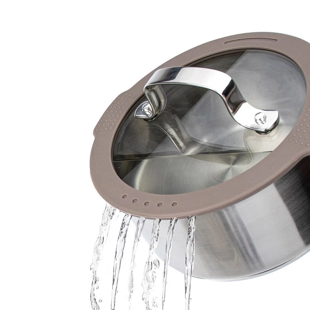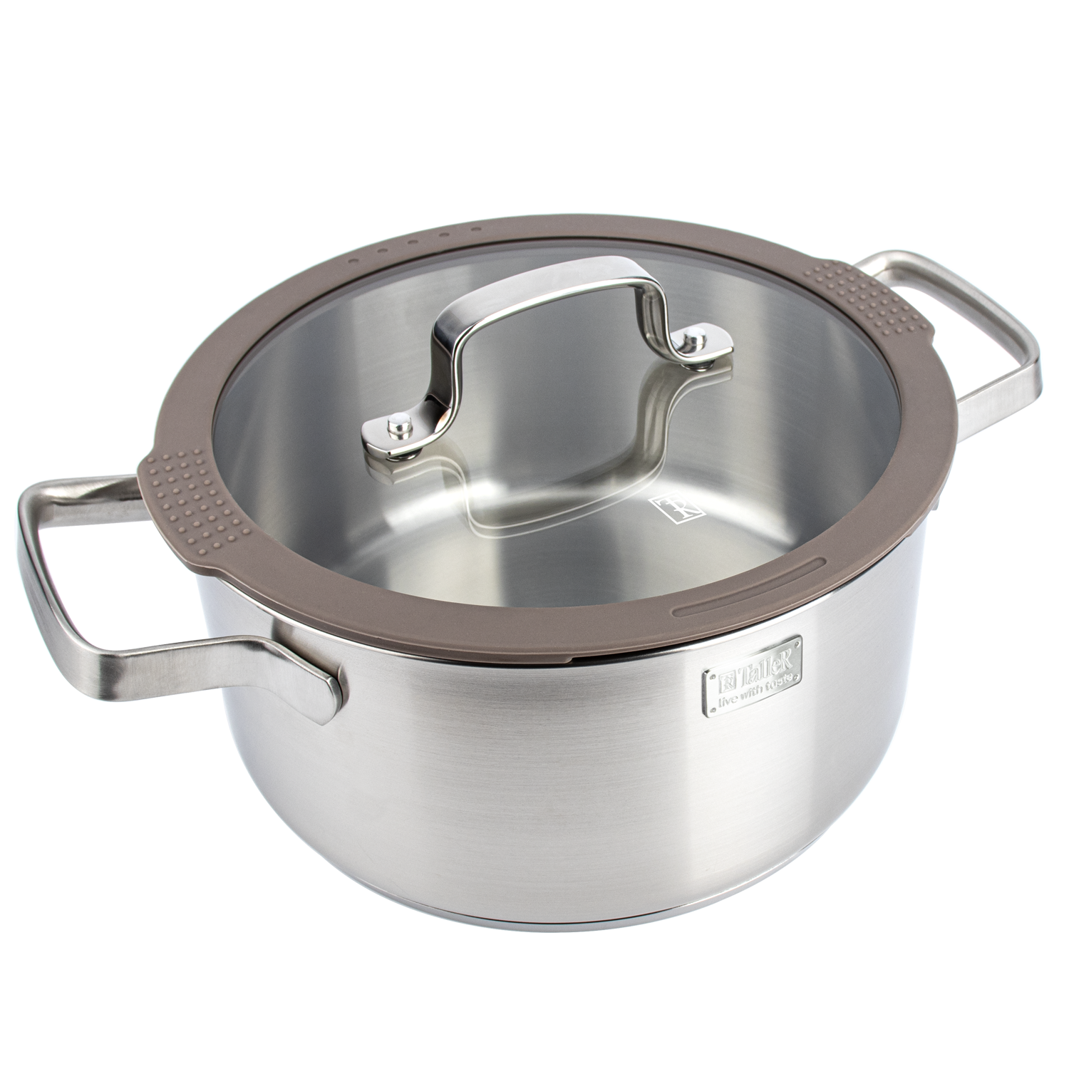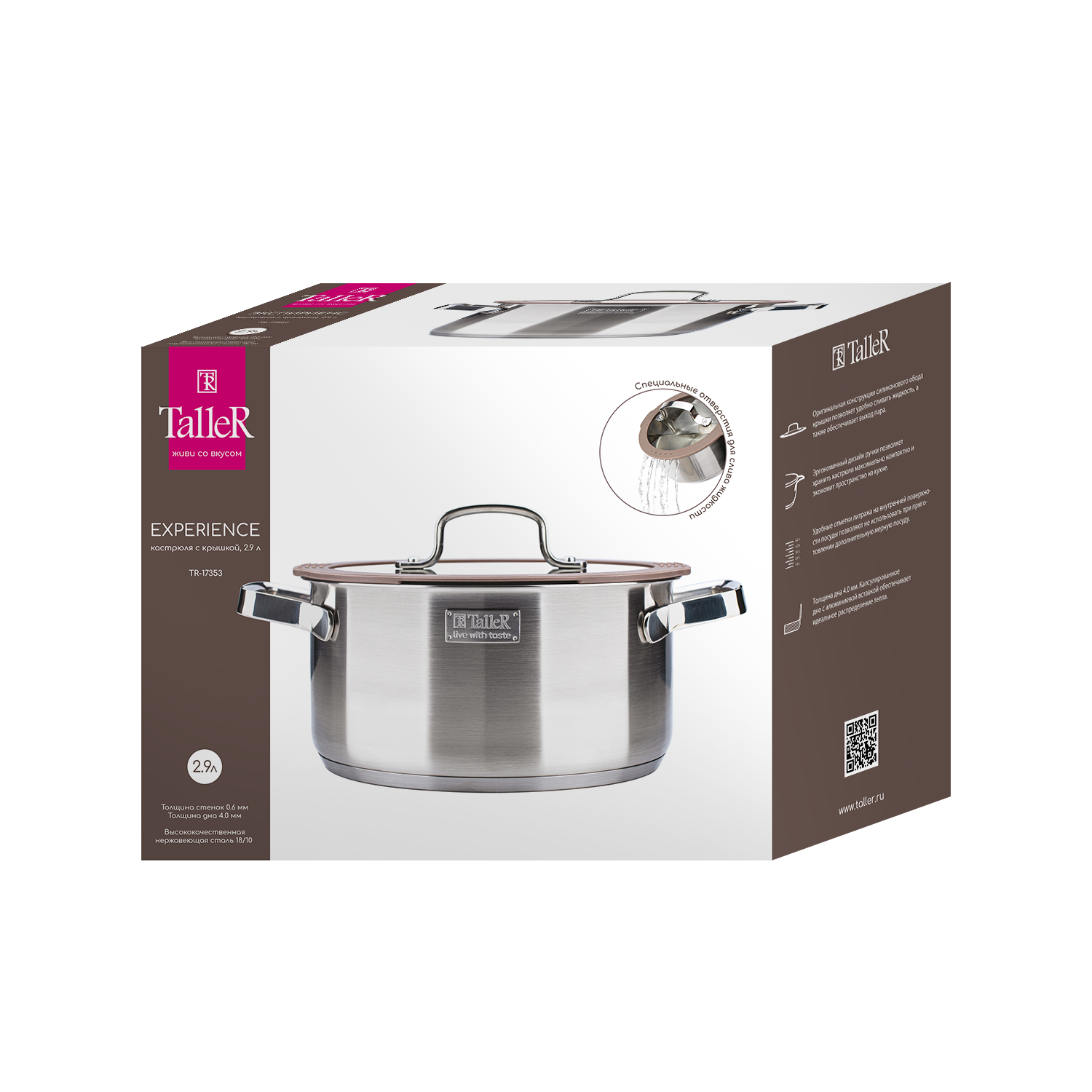 Кастрюля объемом 2,9 л изготовлена из нержавеющей стали, железа и алюминия. В дно, толщина которого 4 мм, встроен антидеформационный диск, увеличивающий прочность. Есть внутренняя градуировка, ручки и отверстие для слива жидкости. В комплекте идет крышка с клапаном для выпуска пара.