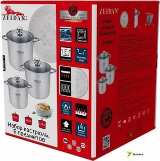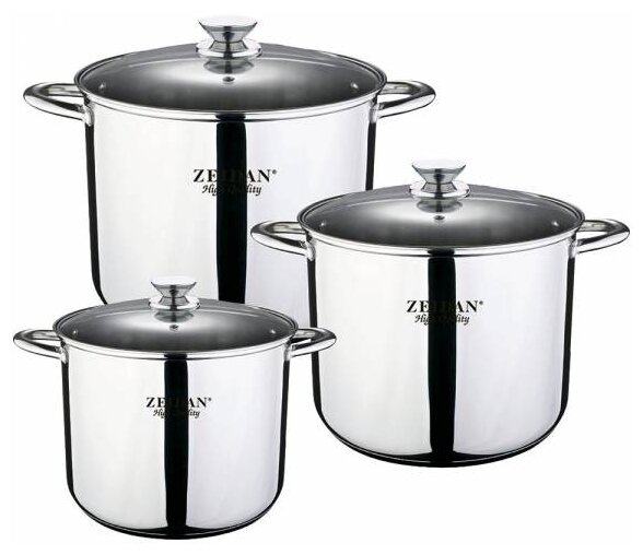 3 кастрюли: 9.5 л, 12 л, 14л; 3 крышки