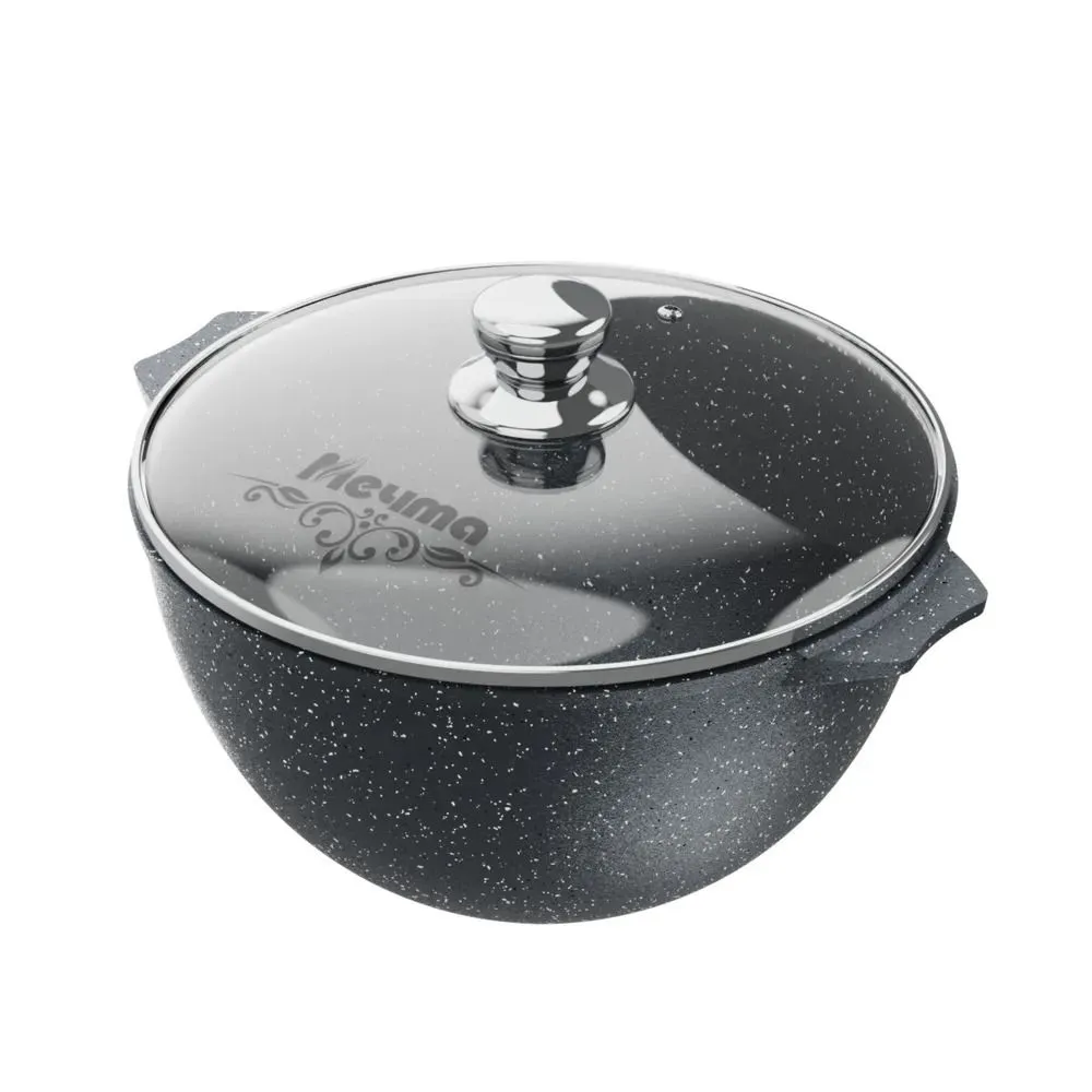 Казан оптимален для варки бульонов, тушения, томления и приготовления плова. Широкое дно отвечает за устойчивость посуды на плите и обеспечивает равномерный разогрев емкости. Крышка из термостойкого стекла плотно прилегает к краям и дополнена ручкой из качественного сплава.