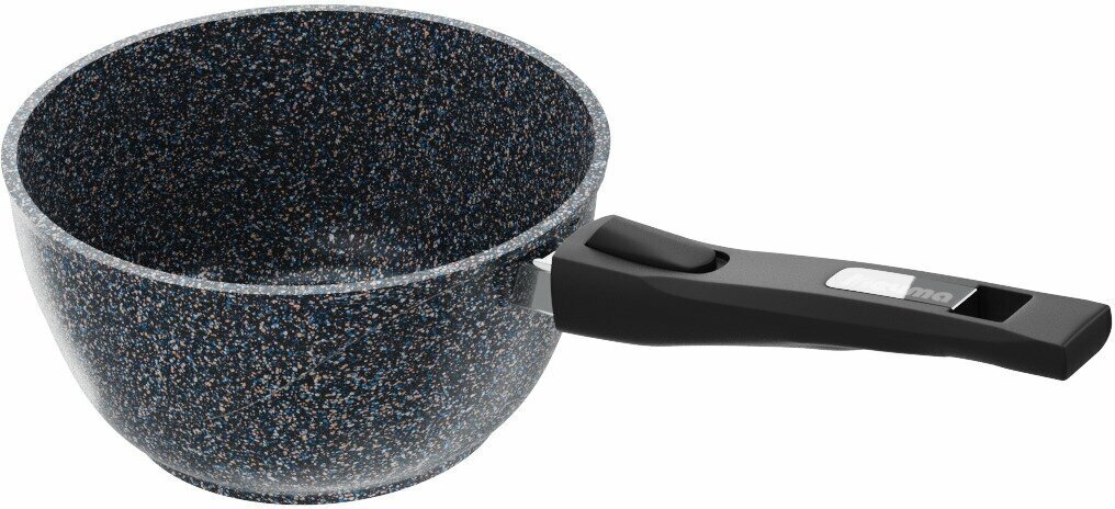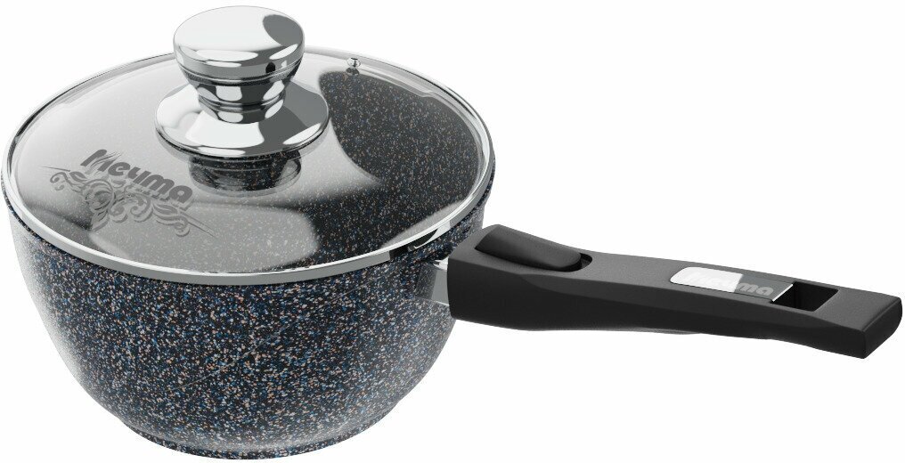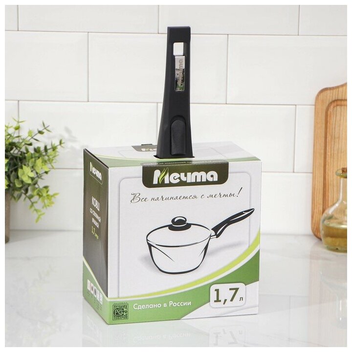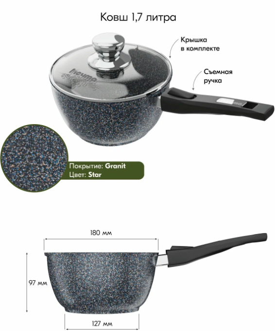 Алюминиевый ковш обладает объемом 1,7 л. Модель можно использовать на любых типах плит. В комплект входит прозрачная стеклянная крышка с пароотводным отверстием. Съемная ручка выполнена из бакелита — термоустойчивого материала, который всегда остается холодным. Эта модель снабжена антипригарным покрытием.