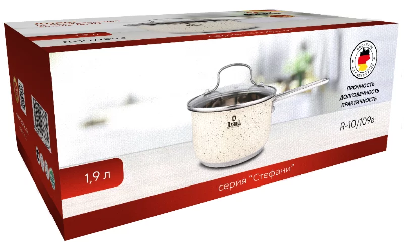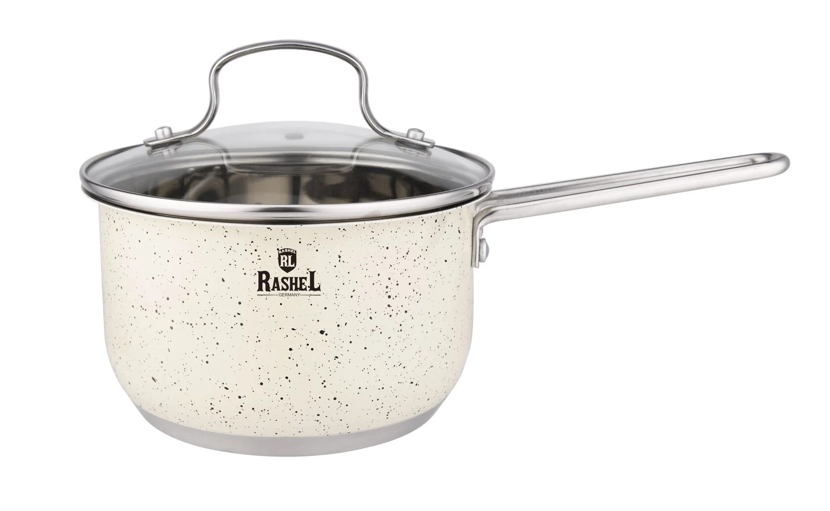 Ковш 1,9 л(объем до краев) Рашел из серии Стефани выполнен из экологичной высококачественной нержавеющей стали 18/10. Экологичный долговечный материал устойчив к коррозии. На корпус ковша нанесено антипригарное гранитное покрытие.