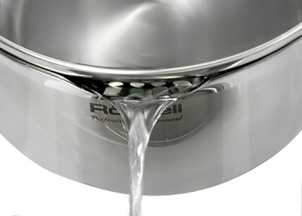 Нерж. сталь 18/10. Тройное дно без воздушных полостей. Оригинальный дизайн крышки для удобного слива жидкости без дуршлага. Ручки из бакелита с покрытием soft touch. Внутренние отметки литража. Для всех видов плит, включая индукционные