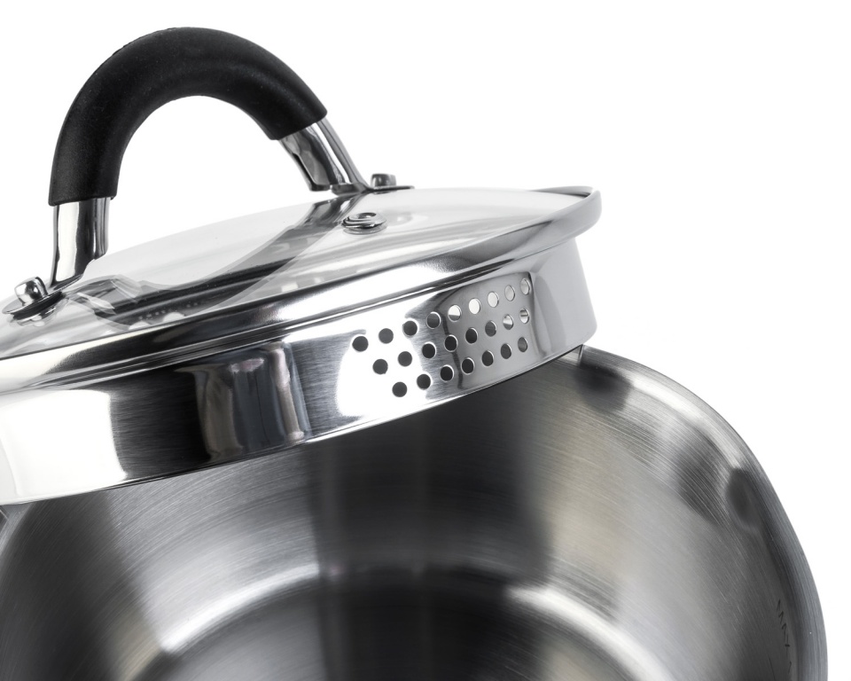 Посуда дополнена удобной мерной шкалой внутри емкости. Ковш поставляется с крышкой, имеющей удобную бакелитовую ручку и отверстие для пара. Посуда легко очищается от загрязнений, не боится долгого замачивания и чистки в ПСМ.