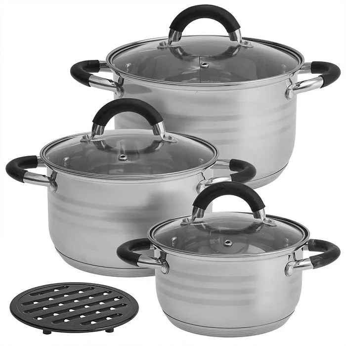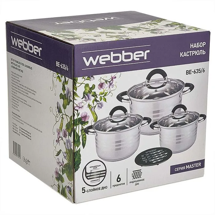 Набор кастрюль WEBBER BE-635/6, 6 предметов. Набор кастрюль из высококачественной нержавеющей стали со стеклянными крышками, с подставкой под горячее. Идеальное приобретение для вашего дома или дачи. Они подойдут для приготовления различных блюд.