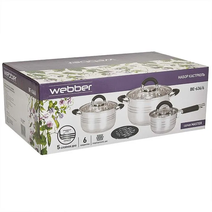 Набор кастрюль WEBBER BE-636/6, 6 предметов. Набор посуды из высококачественной нержавеющей стали со стеклянными крышками, с подставкой под горячее. Идеальное приобретение для вашего дома или дачи. Они подойдут для приготовления различных блюд. Стильный дизайн кастрюль, который впишется в любой интерьер кухни дома и на даче.