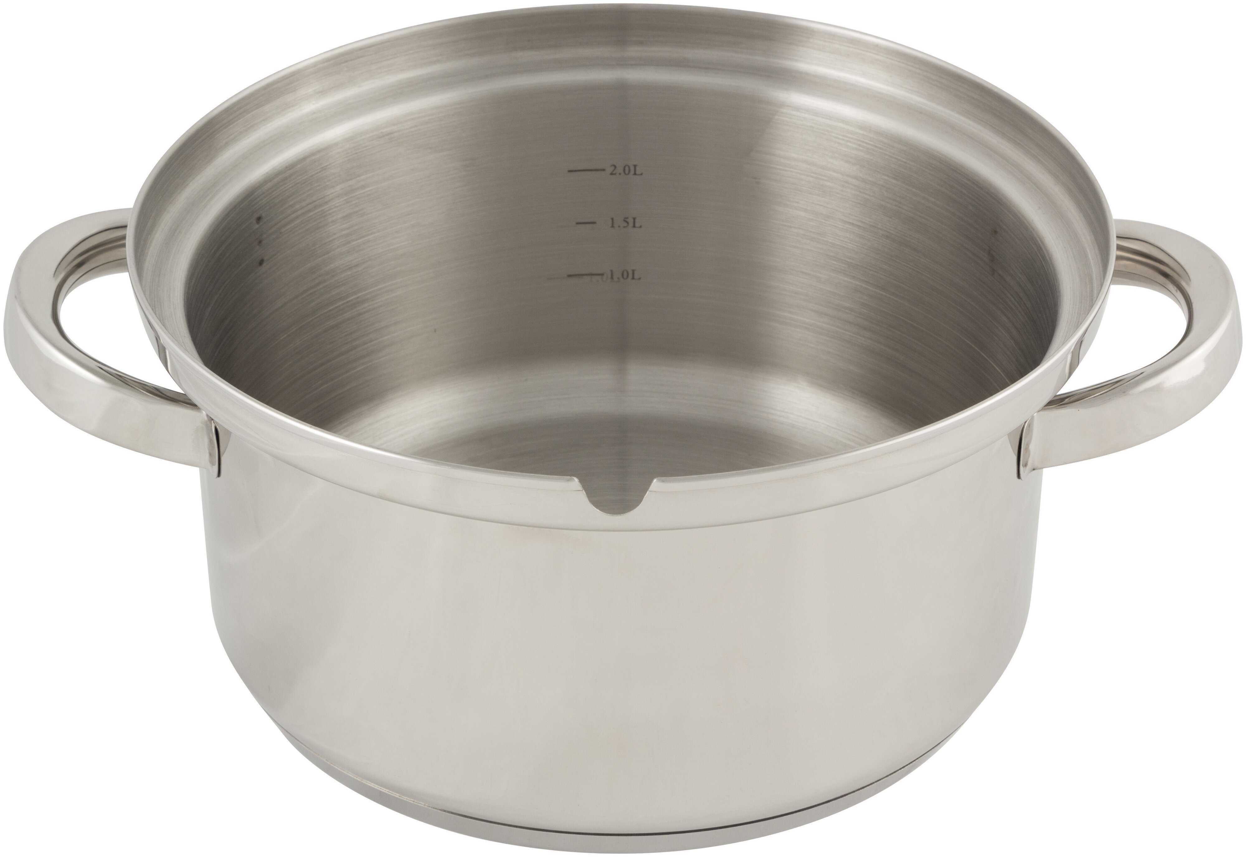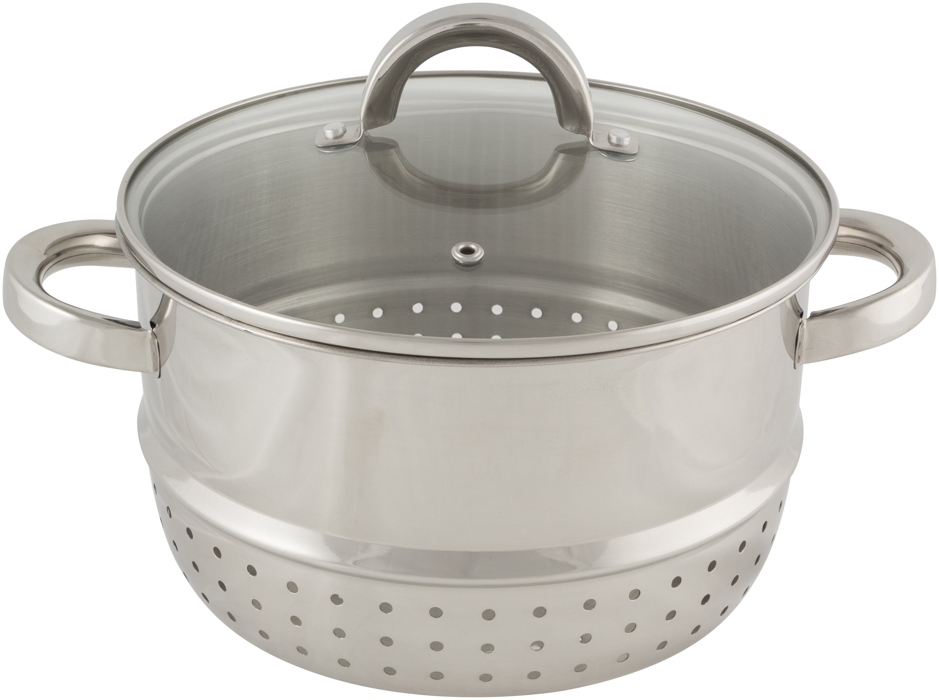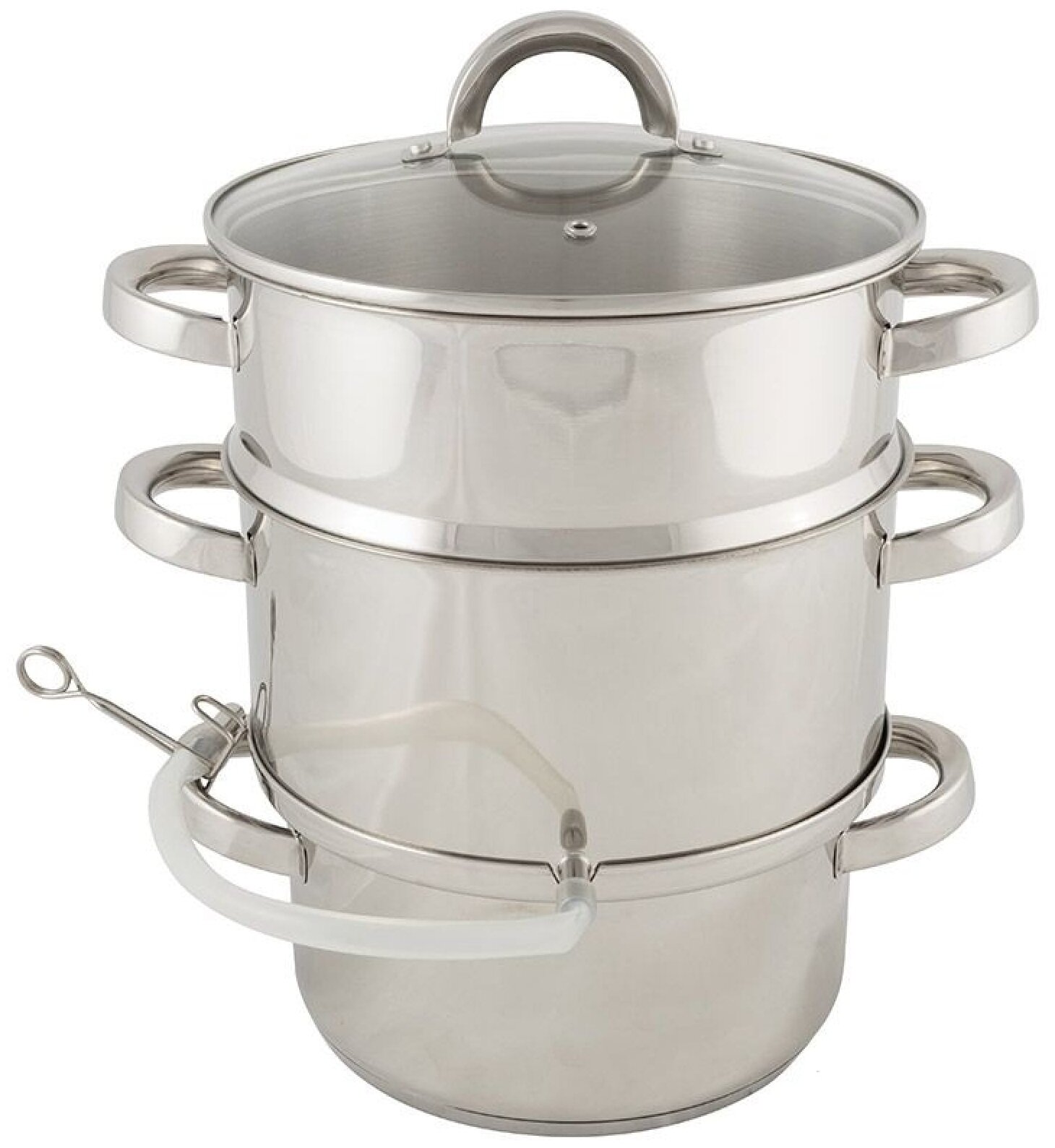 однослойное дно; материал крышки: стекло; материал ручек: сталь; чаша для воды - 20х11 см, чаша для сока - 22х12,5 см, чаша для фруктов/дуршлаг - 22х12,5 см