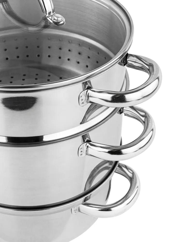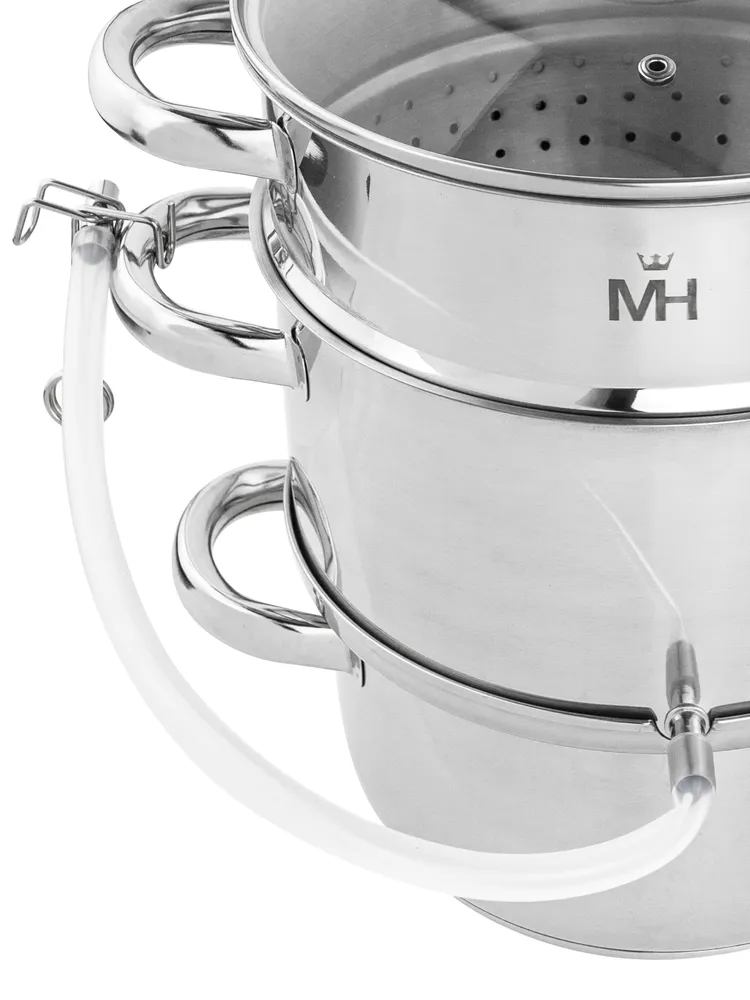 Соковарка с пароотводом. Соковарка с крышкой 26*42 см из высококачественной нержавеющей стали 18/10. Термоаккумулирующее дно. Толщина стенок 0,5 мм, Толщина дна 2,0 мм. Крышка из закаленного стекла. Мерная шкала. Подходит для всех видов плит, включая индукцию.