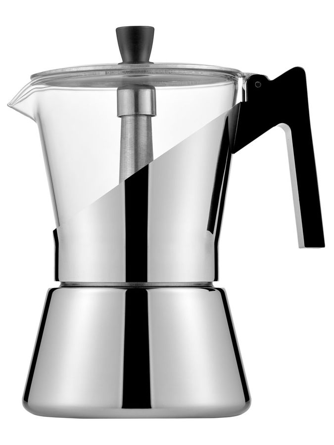 Стильная гейзерная кофеварка. Надёжная и технологичная. Подходит для всех типов плит, включая индукционные. Элегантный корпус изготовлен из качественной нержавеющей стали и закалённого стекла.