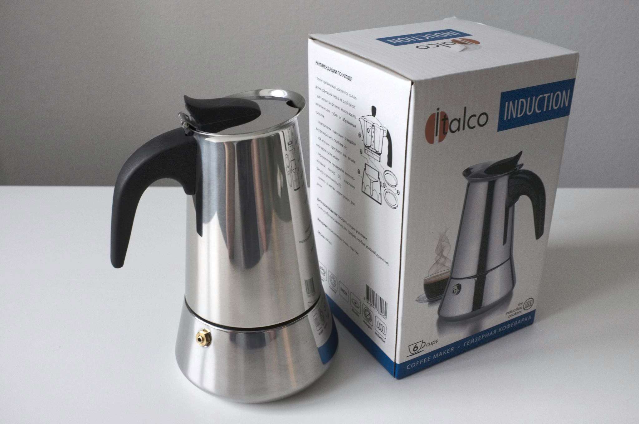Особенности: Кофеварка подходит для всех типов плит, включая индукционные. Корпус из нержавеющей стали. Предохранительный клапан давления, ручка и кнопка выполнены из прочного нейлона.