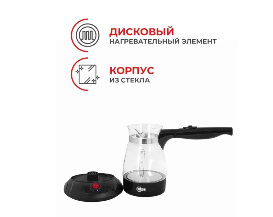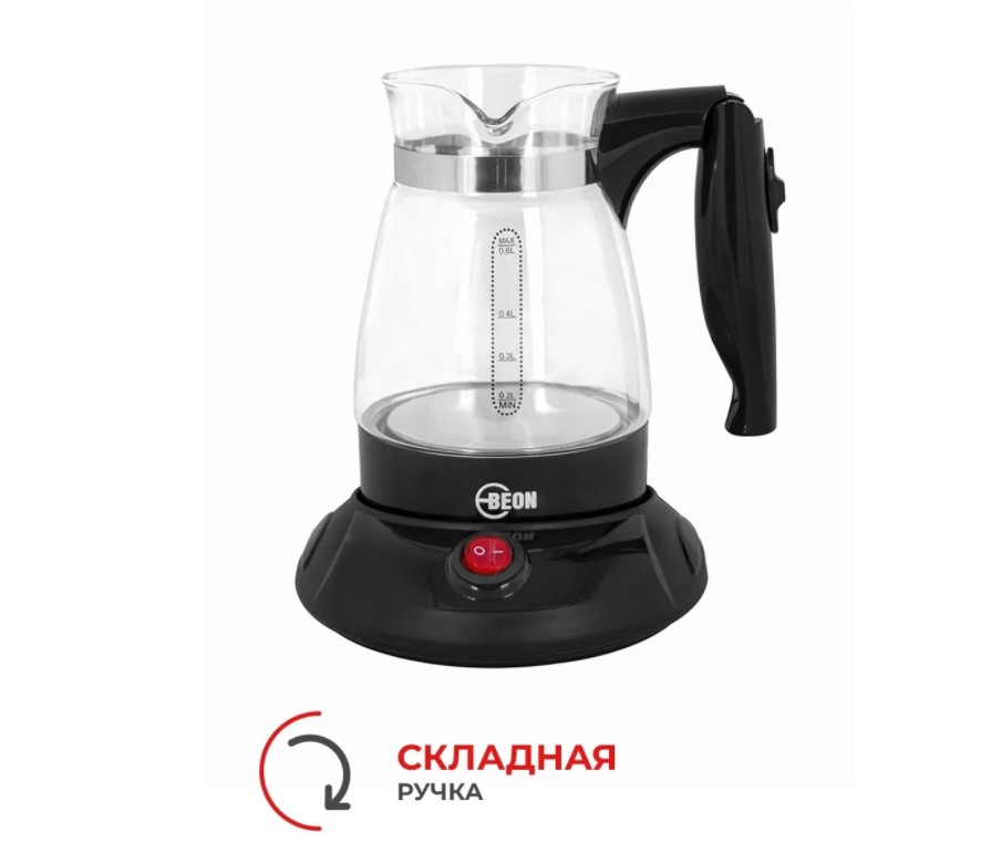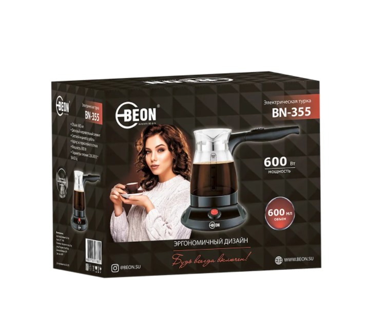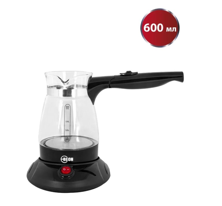 Недорогая и удобная электрическая кофеварка-электротурка для приготовления кофе по-восточному. Электрическая турка Beon станет для Вас надежной помощницей в приготовлении ароматного бодрящего напитка в домашних условия, или на небольшой офисной кухне. Работает с молотым кофе, причем для получения наилучшего результата следует использовать помол максимальной дисперсности. Полезный объем (0,6 л) позволяет за один цикл приготовления получать до 500 мл горячего кофе (5-7 небольших кофейных чашек или 2-3 больших).Дисковый нагревательный элемент мощностью 600 Вт доводит весь объём до кипения всего за 3 мин. Складная ручка помогает экономить место на кухне. Эта модель не имеет автоматического выключателя и требует ручного контроля пользователя во время закипания. Кроме заваривания кофе может использоваться в качестве открытого электрического чайника для быстрого подогрева воды.