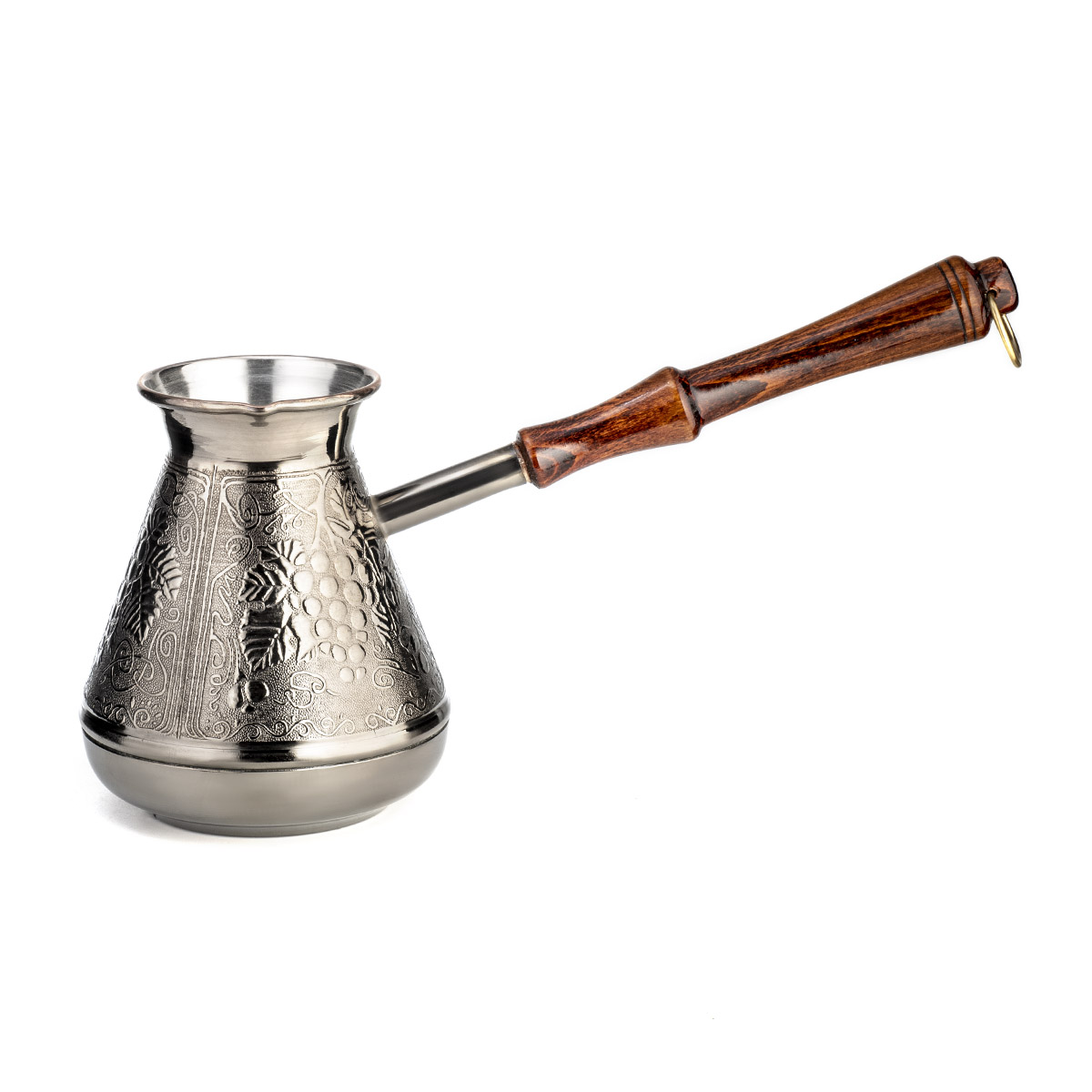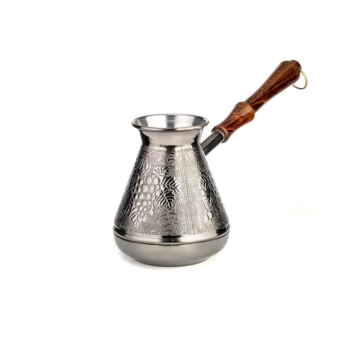 Как приятно выпить чашку свежего только что сваренного кофе. Подлинная находка для любителей настоящего ароматного напитка – турка LARA. Турка латунного цвета выполнена из высококачественной меди в аутентичном дизайне с изящным узором «Виноград». Произведено в России. Удобная лакированная ручка из натурального дерева не будет нагреваться при использовании, а металлическое кольцо позволит подвешивать турку и удобного хранить её. Узкое горлышко способствует наилучшему раскрытию вкуса. Подходит для приготовления натурального кофе на газовых и электрических плитах. Турка дополнит кухонный интерьер и подарит новый опыт в приготовлении кофе.