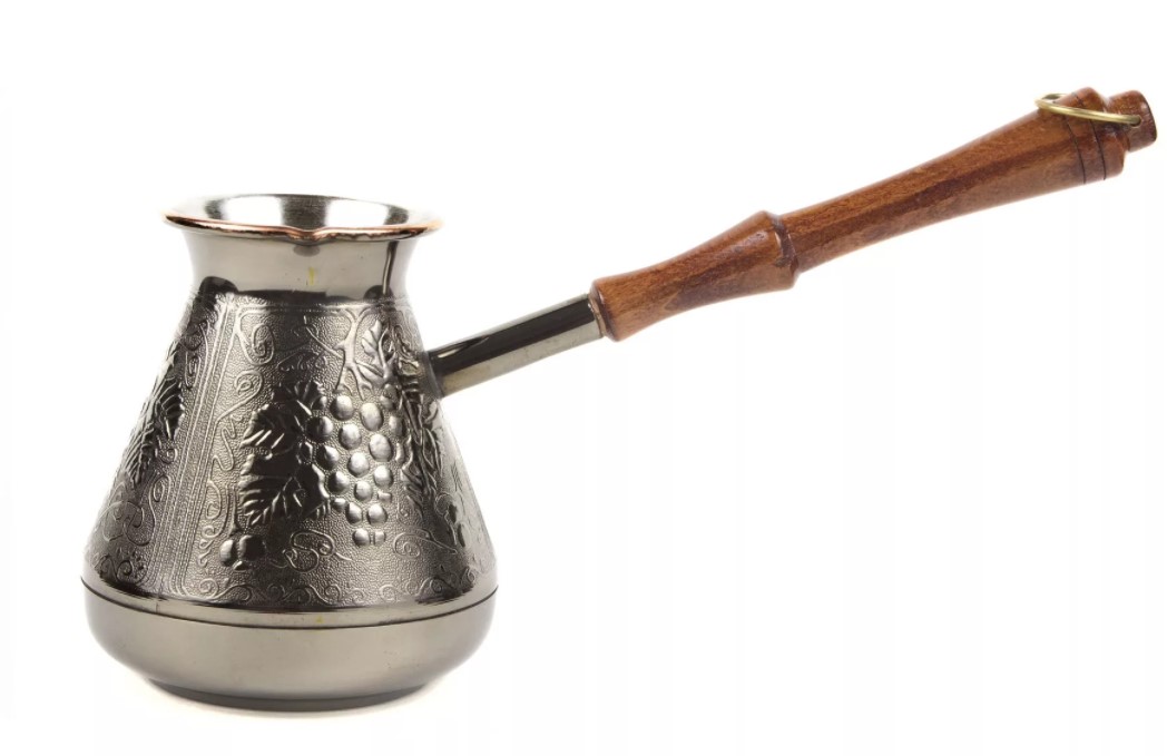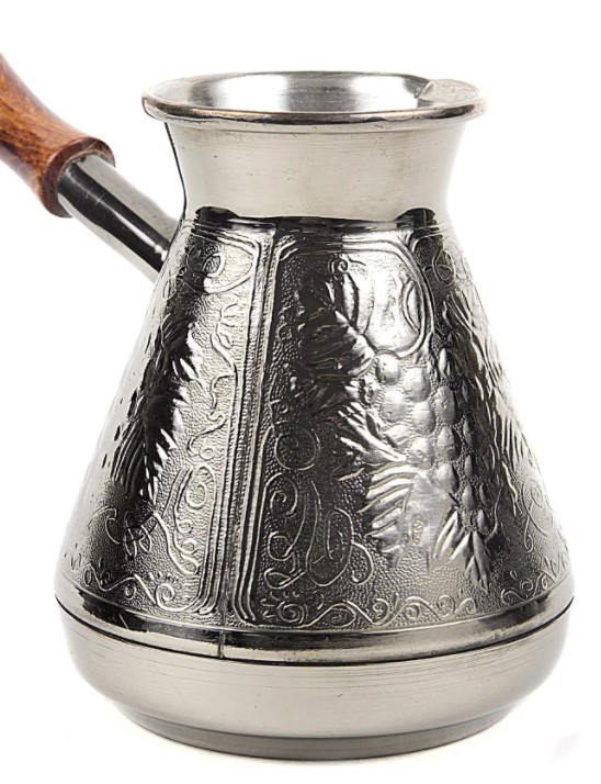 Медная турка классической конусообразной формы с утолщённым дном предназначена для приготовления ароматного натурального кофе. Внутренняя поверхность покрыта пищевым оловом. Наружная сторона украшена оригинальным орнаментом.