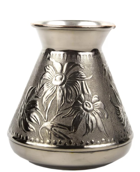 Медная турка классической конусообразной формы с утолщённым дном предназначена для приготовления ароматного натурального кофе. Внутренняя поверхность покрыта пищевым оловом. Наружная сторона украшена оригинальным орнаментом.