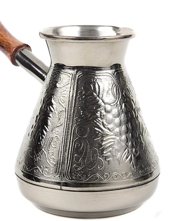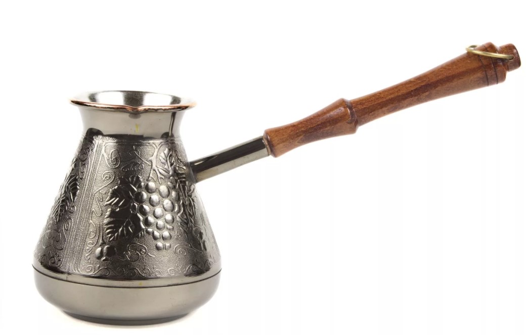 Медная турка классической конусообразной формы с утолщённым дном предназначена для приготовления ароматного натурального кофе. Внутренняя поверхность покрыта пищевым оловом. Наружная сторона украшена оригинальным орнаментом.