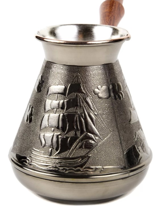 Медная турка классической конусообразной формы с утолщённым дном предназначена для приготовления ароматного натурального кофе. Внутренняя поверхность покрыта пищевым оловом. Наружная сторона украшена оригинальным орнаментом.