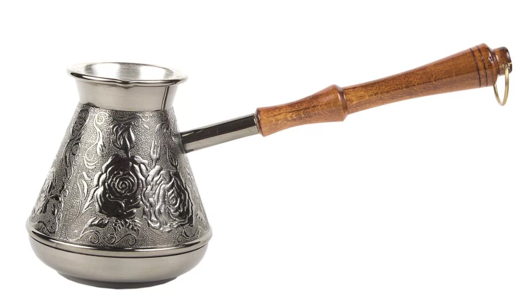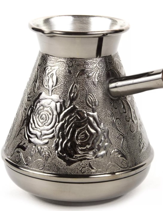 Медная турка классической конусообразной формы с утолщённым дном предназначена для приготовления ароматного натурального кофе. Внутренняя поверхность покрыта пищевым оловом. Наружная сторона украшена оригинальным орнаментом.