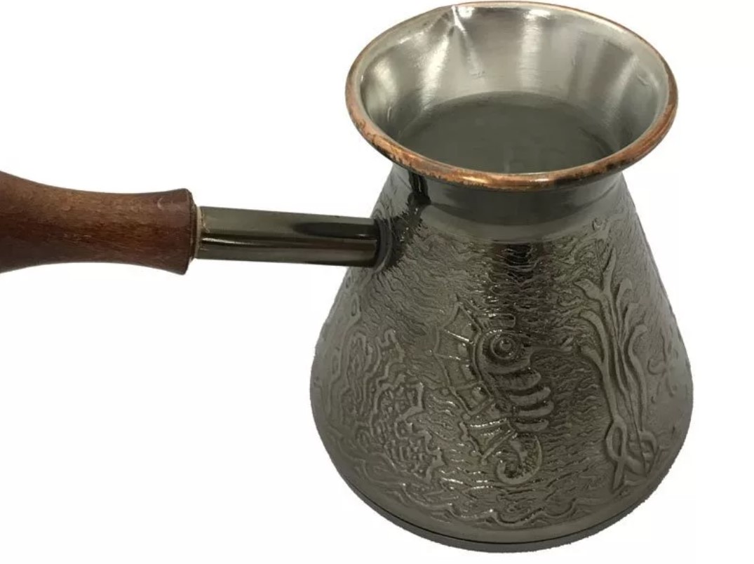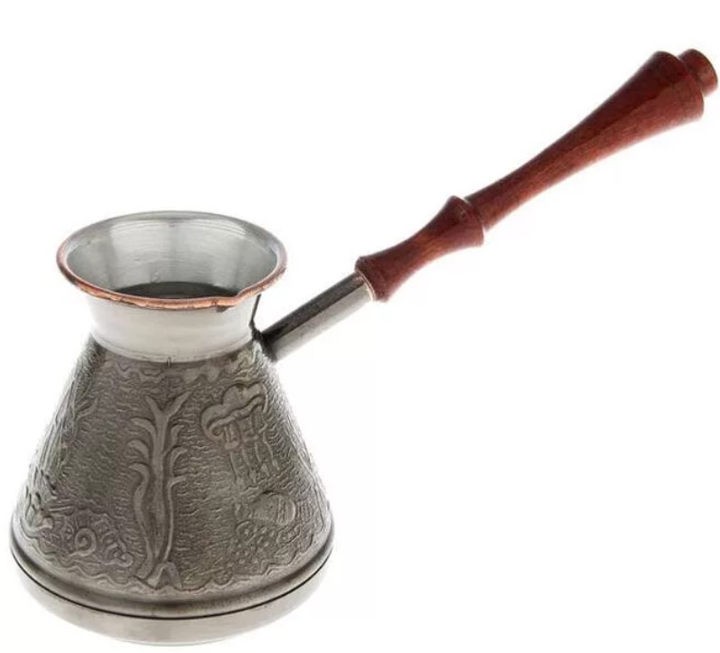 Медная турка классической конусообразной формы с утолщённым дном предназначена для приготовления ароматного натурального кофе. Внутренняя поверхность покрыта пищевым оловом. Наружная сторона украшена оригинальным орнаментом. Деревянная ручка является надёжным теплоизолирующим материалом. Подходит для всех типов плит, кроме индукционных. Проста в эксплуатации.