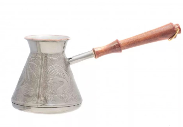 Медная турка классической конусообразной формы с утолщённым дном предназначена для приготовления ароматного натурального кофе. Внутренняя поверхность покрыта пищевым оловом. Наружная сторона украшена оригинальным орнаментом.