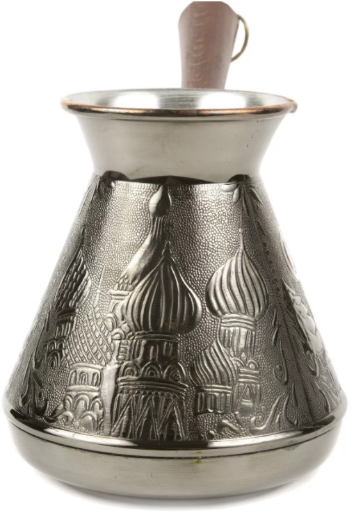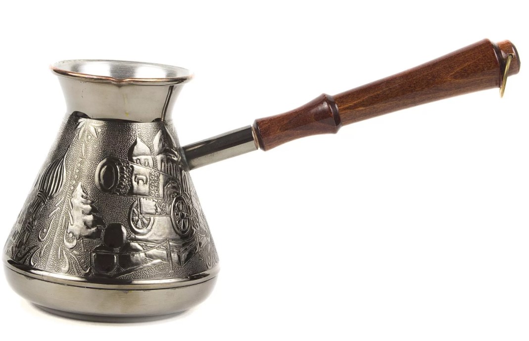 Медная турка классической конусообразной формы с утолщённым дном предназначена для приготовления ароматного натурального кофе. Внутренняя поверхность покрыта пищевым оловом. Наружная сторона украшена оригинальным орнаментом.