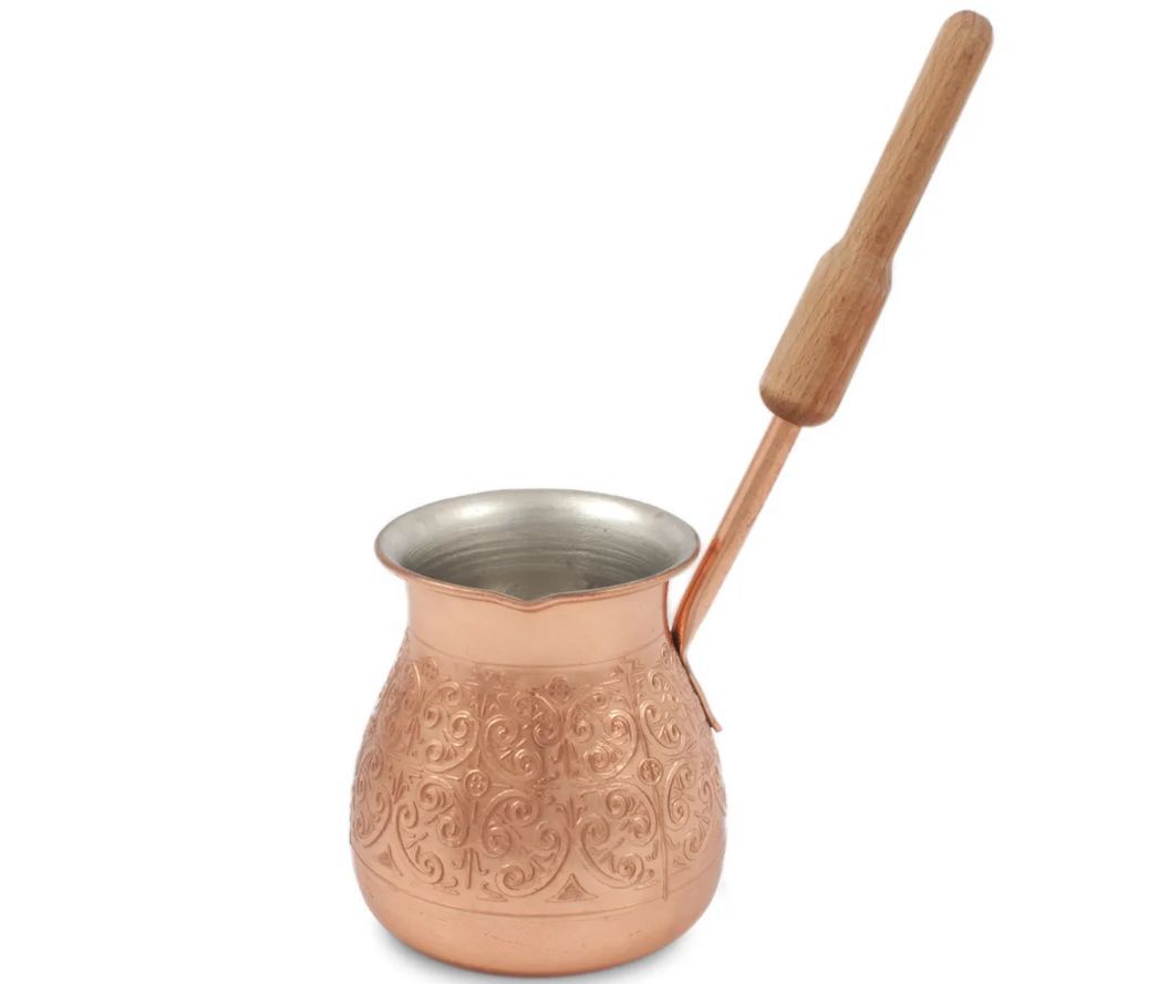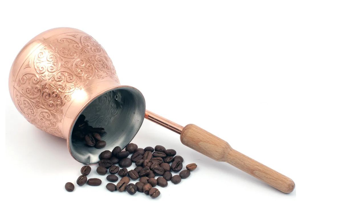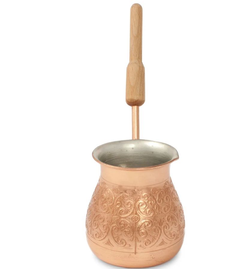 Турка изготовлена из меди, прекрасно подходит для приготовления настоящего кофе на плите. Внешняя поверхность имеет декоративное тиснение, что придает изделию оригинальный внешний вид. Внутренняя сторона покрыта пищевым оловом. Изделие оснащено небольшим носиком и удобной не нагревающейся деревянной ручкой с петелькой для подвешивания. Надежное крепление ручки гарантирует безопасное использование.