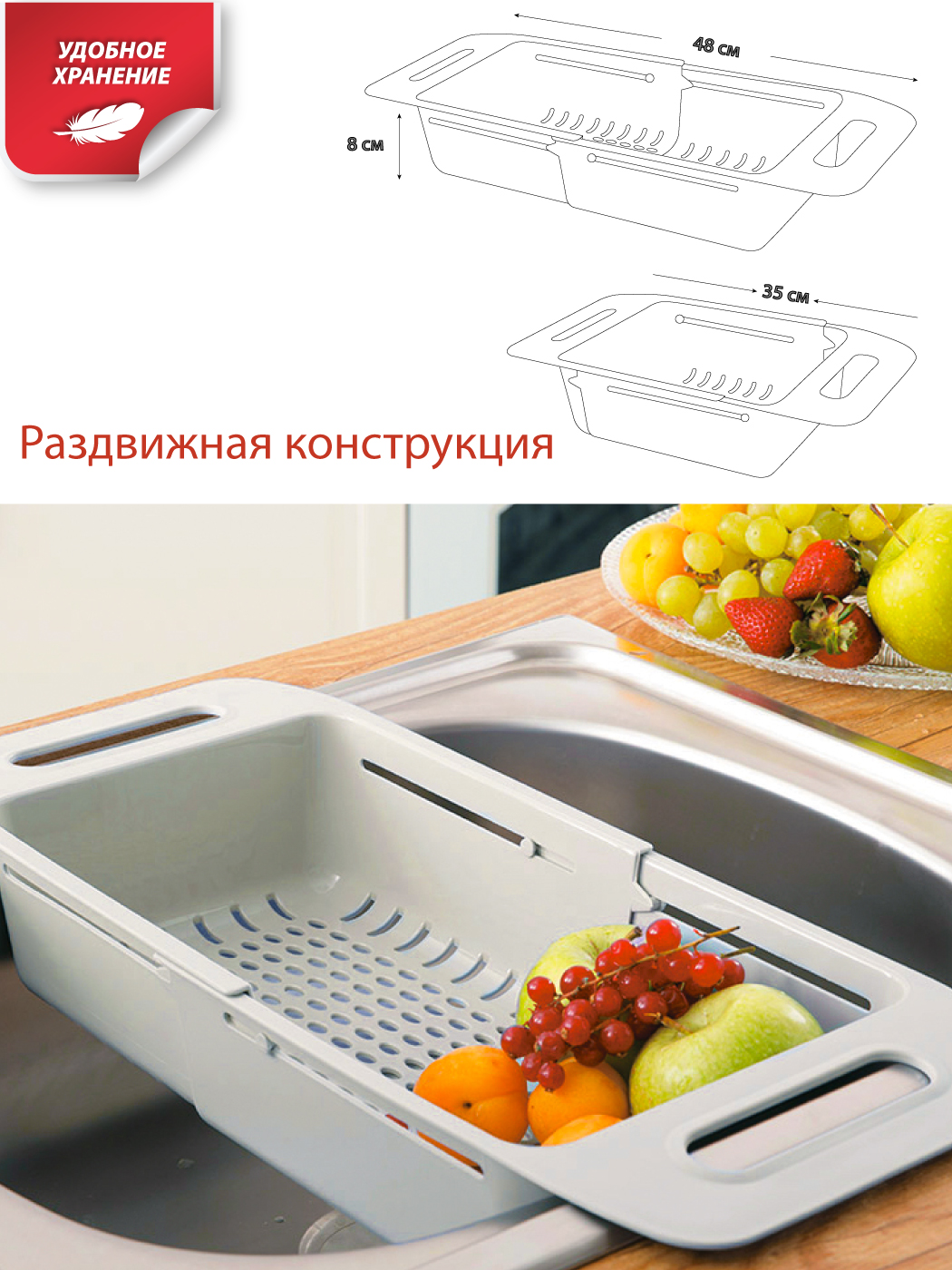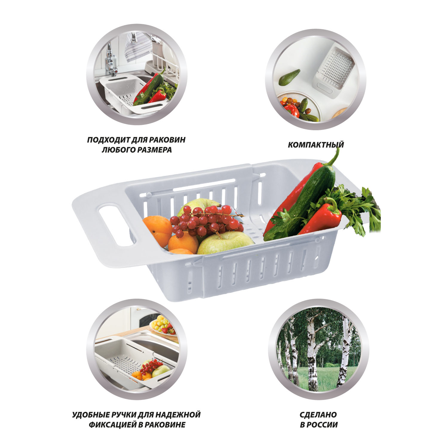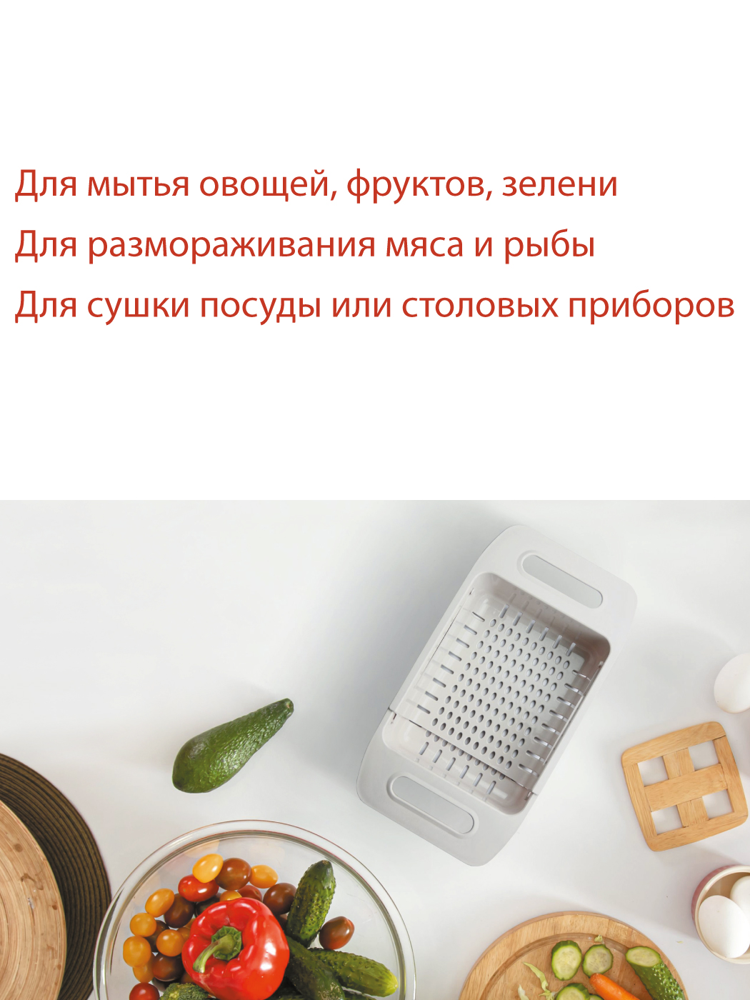 Дуршлаг Orion отлично подойдет для размораживания и мытья продуктов. За счет раздвижной конструкции его можно использовать в раковинах любого размера и мойках. Оснащен удобными ручками для надежной фиксации в раковине.