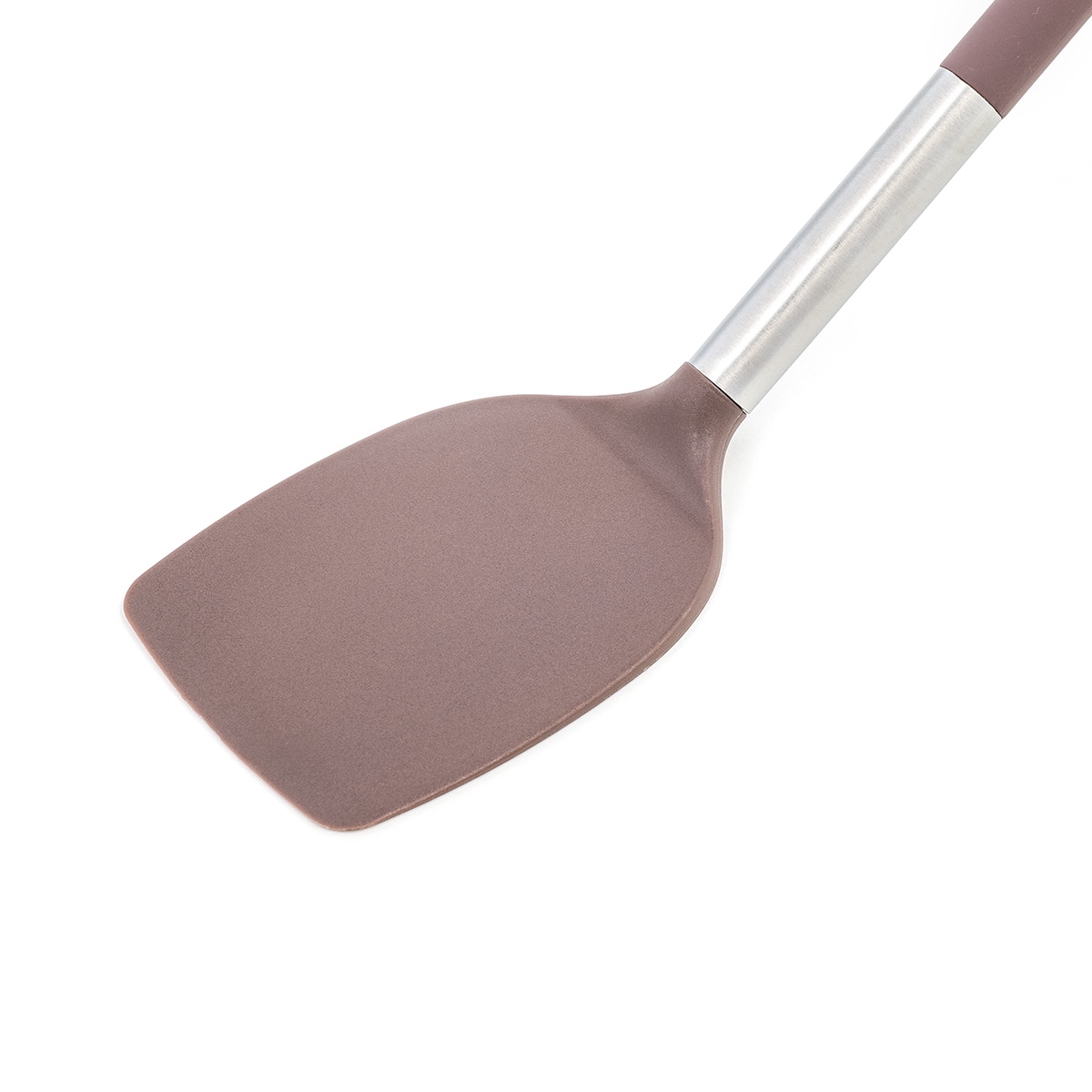 Кухонные аксессуары давно стали не только инструментом, но и предметом интерьера. Серия выполнена в шоколадно-кофейном цвете. Рукоятка с нежным TPR-покрытием. Гигиеничность используемого нейлона соответствует американским стандартам FDA. Переходной патрубок из нержавеющей стали 18/0. Все части изделия тщательно подогнаны и закреплены. Имеется отверстие для подвешивания.